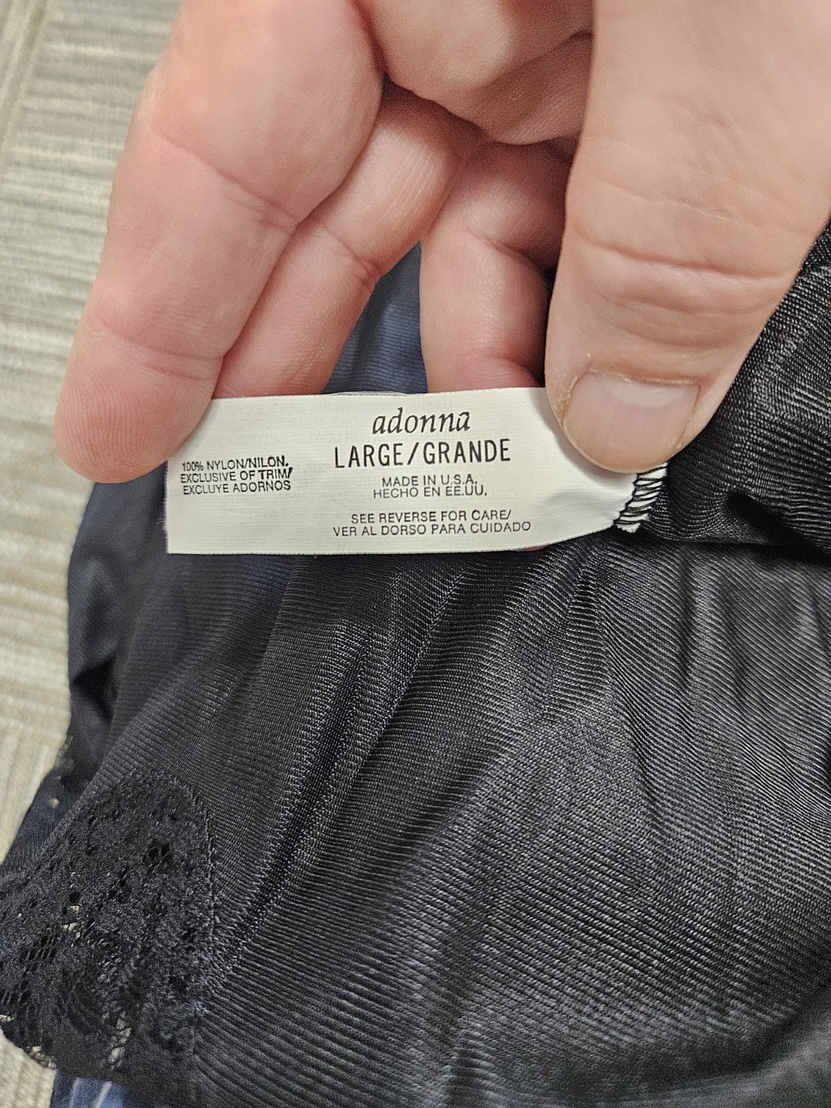 The Vintage Adonna Black Nylon Maxi Half Slip Skirt features a solid black color with lace trim accents and a side slit, adding a touch of retro flair to your wardrobe. Made of lightweight nylon fabric, this slip is perfect for those who appreciate the classic style of the 70s and 80s. With a size L and regular fit, this piece is machine washable for easy care. Perfect for women looking for a comfortable and stylish addition to their intimates collection, this half slip exudes a timeless hipster vibe with its Adonna brand and vintage appeal.