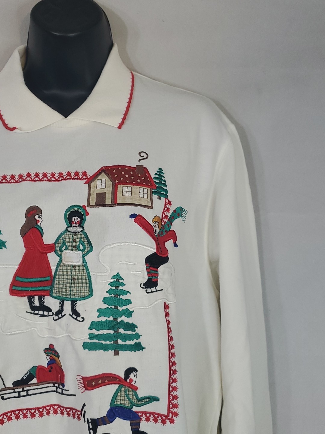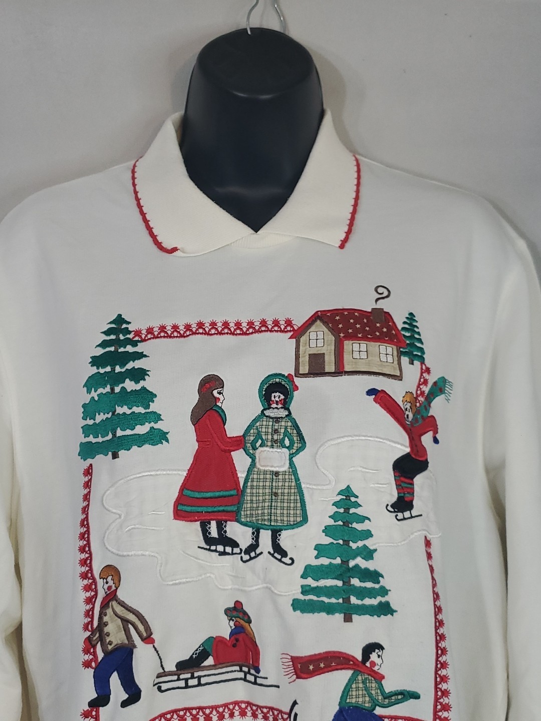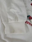 Has tint spots in a couple spots. The photo of the back of the shirt is me trying to oxy a little black spot but it didn't come out. The right arm has stains on the cuff Needs a thorough cleaning