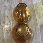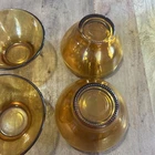 The product is a set of six vintage amber brown clear glass soup cereal bowls, each with a diameter of 5 1/2" and a height of 2 1/2". The bowls have a round shape and a mid-century modern style, with a glossy finish and a production technique of pressed glass. They are machine washable up to 85°F and can be used for all occasions. The vintage bowls are unmarked as to brand and were manufactured during the 1970s, making them a unique and stylish addition to any kitchen or dining collection. Some of the rims of the bowls have wear, we can send better pics if needed.