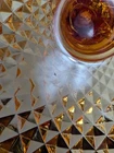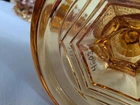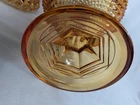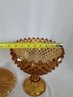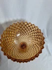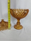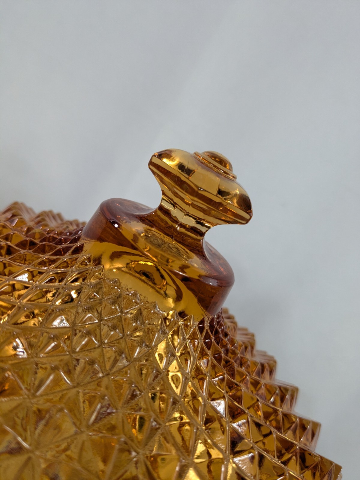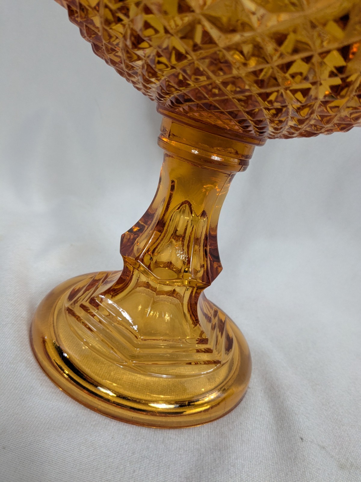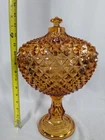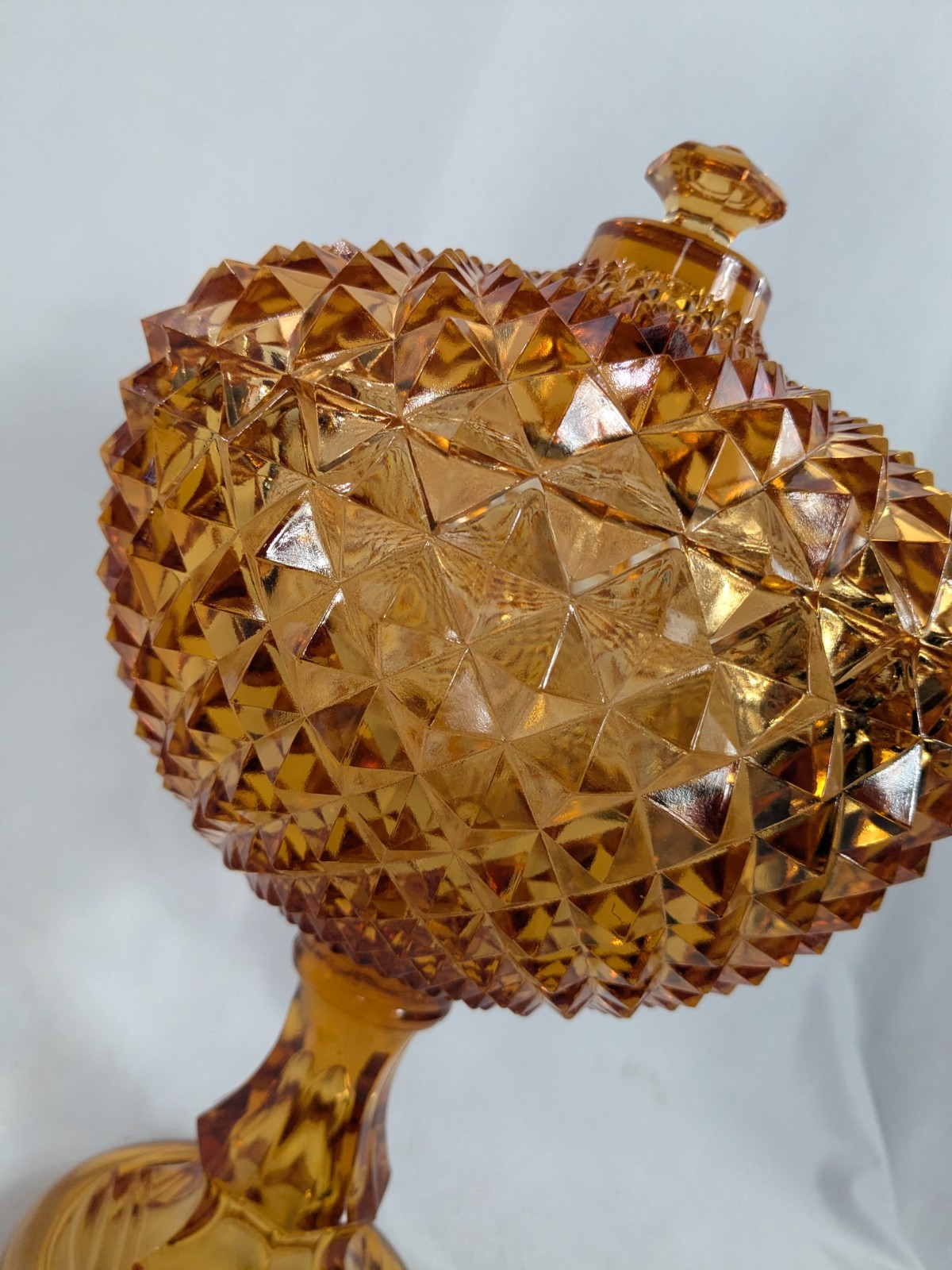 Up for sale is a Vintage Amber Diamond Point Lidded Candy Dish by Westmoreland. This is heavy and large - approx. 8 pounds by itself and 14" tall by 8.5" wide. It is in good condition. There are a few small chips. None that are noticeable at a glance. But on the inside of the lid, two of the teeth are chipped. Some of the teeth are a little rough on the edges. The inside of the bowl also appears to have a few very tiny rough spots. This was owned by a collector and kept in a glass case.