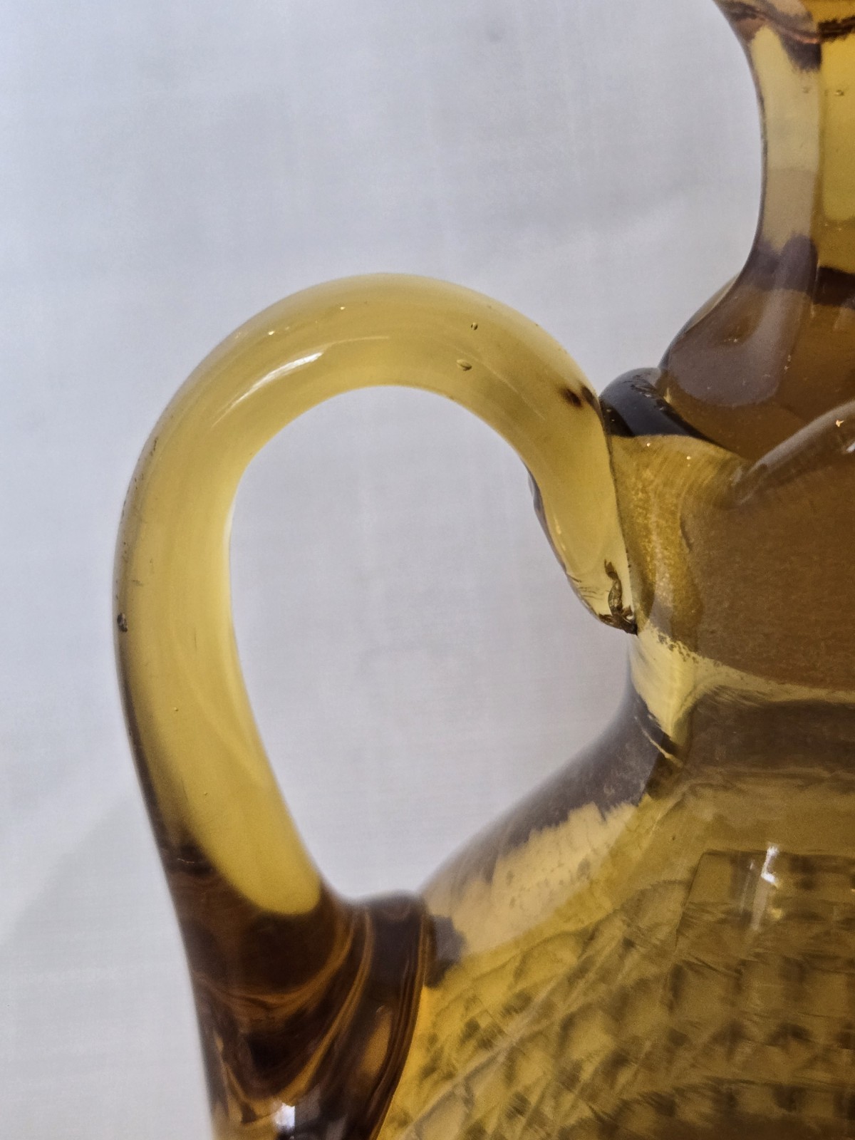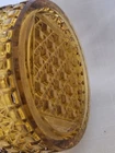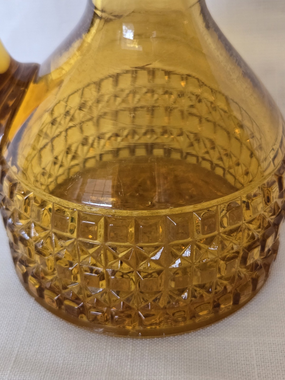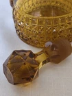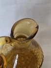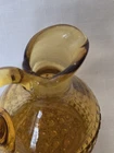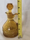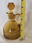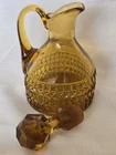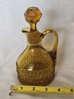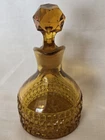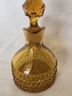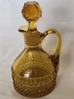 Beautiful vintage amber glass cruet / decanter featuring a diamond cut geometric pattern, applied handle, and original faceted glass stopper. This piece has wonderful mid-century character and rich golden amber color that displays beautifully in light. Perfect for use as an olive oil cruet, vinegar bottle, or as decorative glass for a vintage kitchen or bar display. No chips or cracks—a very clean example. Details: • Color: Amber • Material: Pressed glass • Style: Mid-Century / Vintage • Includes original matching stopper • Applied handle and pouring spout Approximate Measurements: • Height: ~7 inches (with stopper) • Width: ~4 inches • Base diameter: ~3.5 inches Condition Notes Excellent vintage condition. • No chips or cracks • Stopper fits well • Light air bubbles and character consistent with vintage glass production Please review all photos as they are part of the description. Shipping Ships carefully packed to ensure safe arrival.