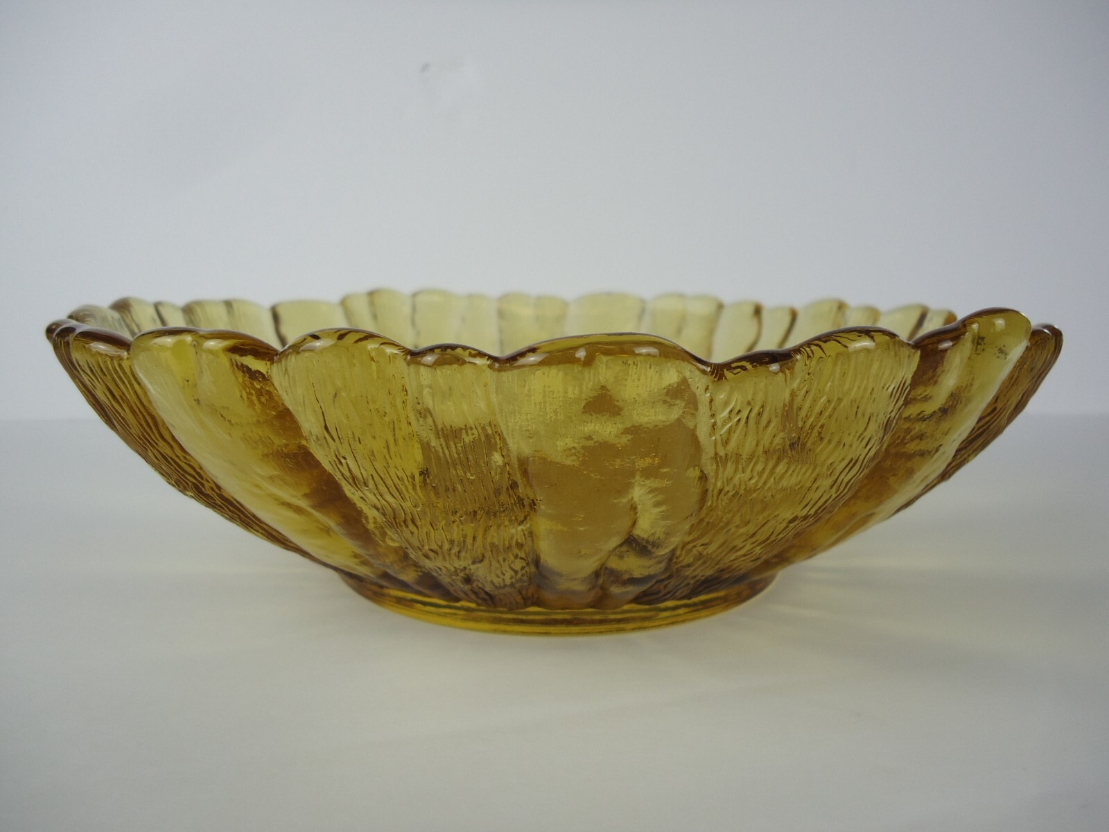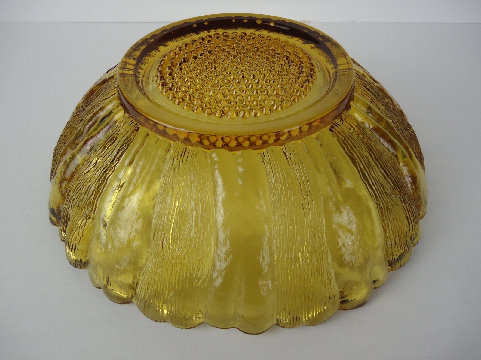 Amber Glass Sunflower Bowl VTG Floral Salad Fruit Decorative Country Farm Yellow. Preowned and in great condition with no chips or cracks. Please see all pictures for measurements and condition. J1