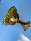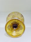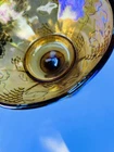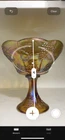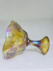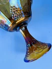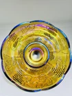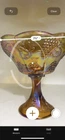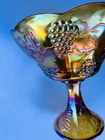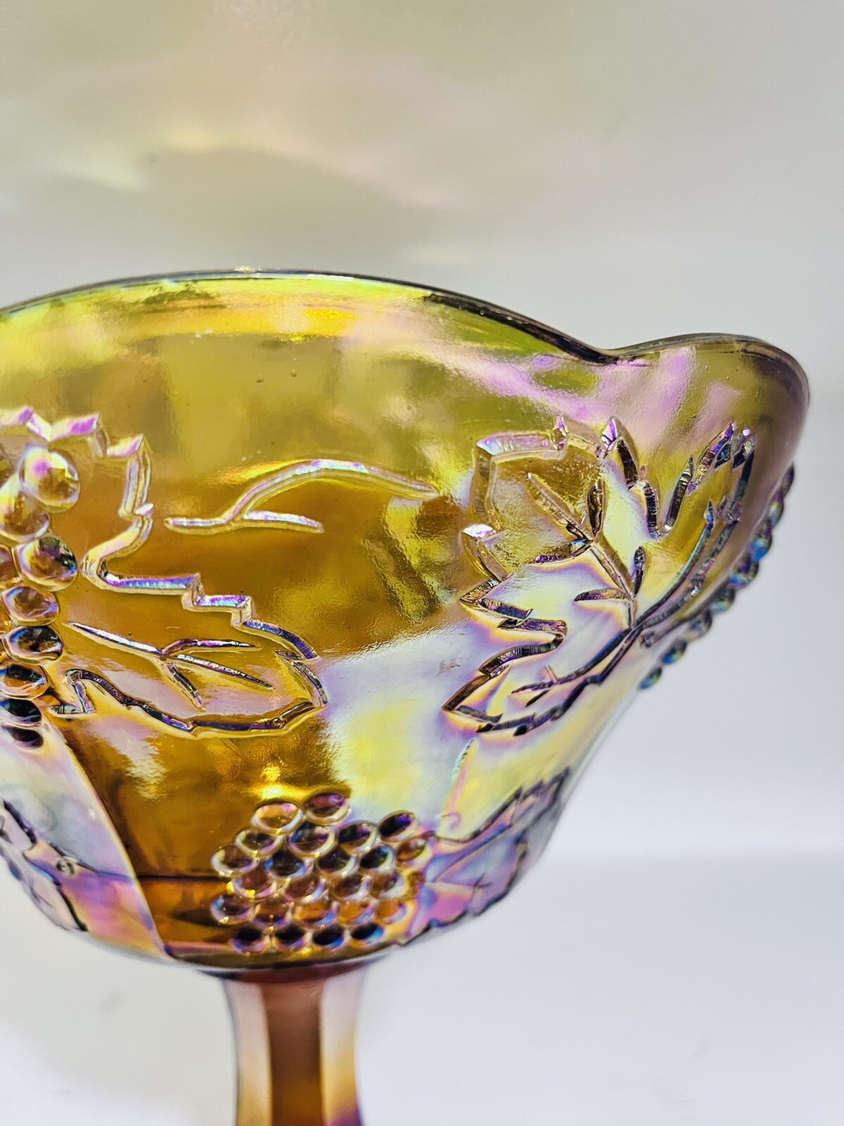 For those who appreciate vintage glassware, this Amber Marigold CARNIVAL GLASS Compote Pedestal Bowl is a must-have. The iridescent finish and intricate grape pattern make it a beautiful addition to any home decor. The set includes a dessert bowl, fruit bowl, serving bowl, pedestal bowl, and regular bowl, all with a round shape and a depth of 3.75 inches. The production technique used is fused glass, and the item was originally made in America. Its style is Mid-Century Modern and it weighs 3 pounds and 5 ounces. The Harvest Grape pattern adds a touch of elegance to any occasion, and it's perfect for serving fruit or dessert. This vintage piece is in excellent condition and is sure to be the centerpiece of any room. Beautiful Each one sold separately 10/17