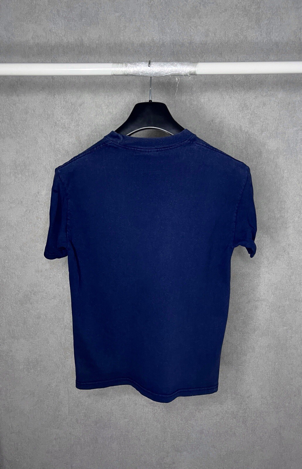 This is a vintage-style T-shirt featuring a design inspired by America's spaceport and NASA. The T-shirt is a size large and is made of cotton in a blue color. It is a short sleeve shirt designed as a unisex style for adults. The shirt showcases a unique theme and branding, making it a standout piece for those interested in space exploration and American history. Made in the United States, this T-shirt combines comfort with a patriotic and space-inspired design.