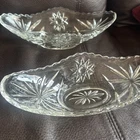 This product is a set of four vintage Anchor Hocking glass banana boats, each measuring 9.5" x 4.25". The glasses are clear and made of glass, and they belong to the Early American Prescut/EAPC product line. They are also vintage items. The brand of the glasses is Anchor Hocking, and the number of items in the set is four. Beautiful used condition!