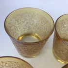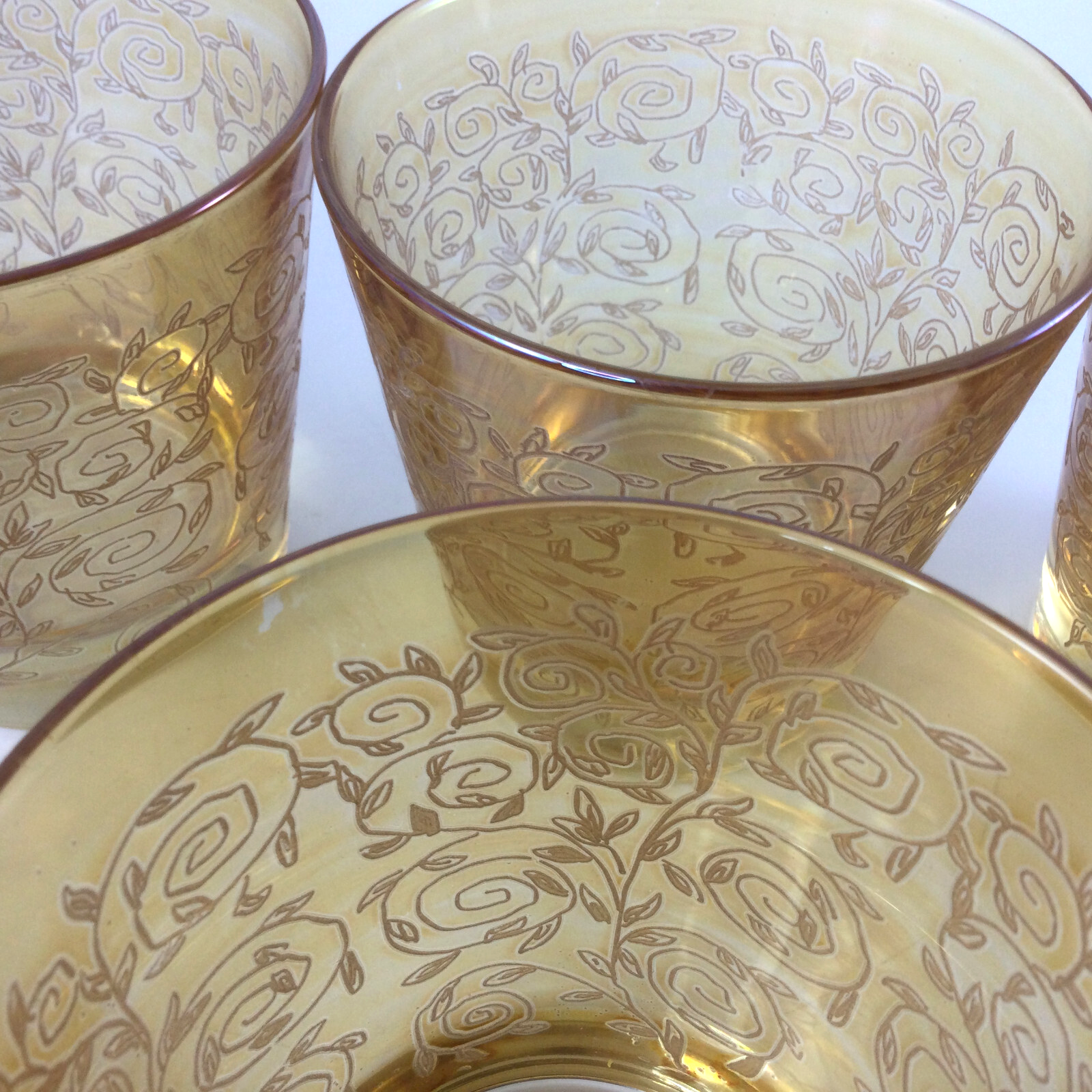 Vintage Anchor Hocking Amber Colored Tumbler Glasses Etched Rose Pattern 3.5" H. Very good condition, no cracks or chips. InvN/GS/6