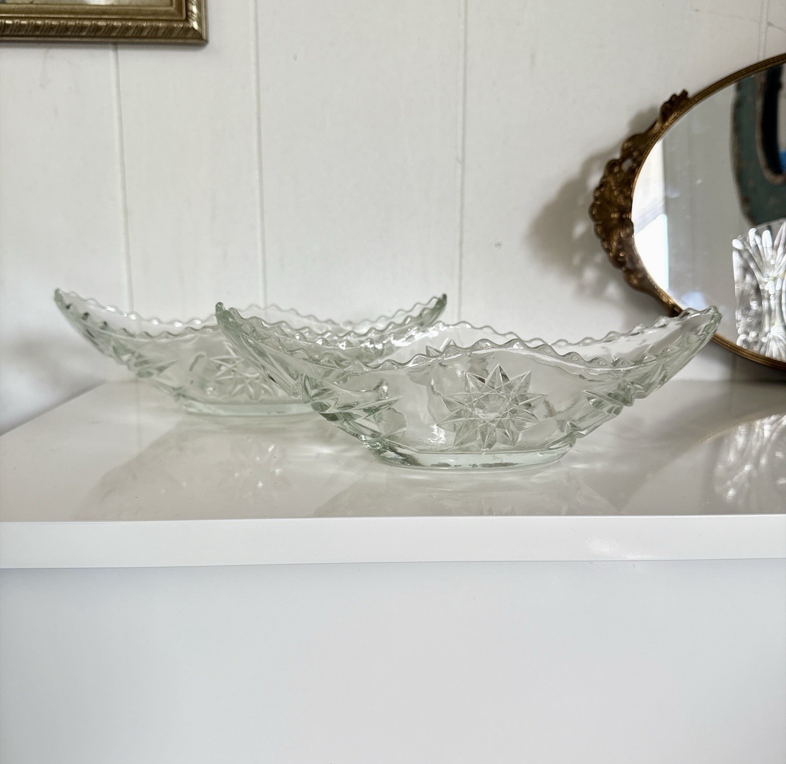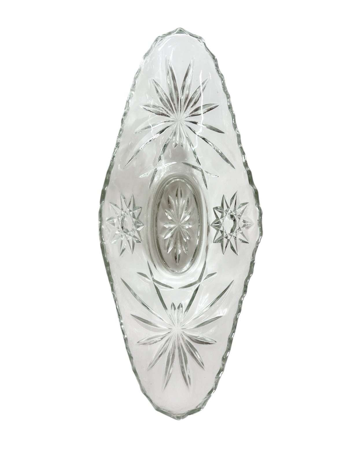 Elevate your dessert presentation with the Vintage Anchor Hocking Banana Boat Star of David Crystal Dessert Set. This two-piece collection features oval bowls adorned with the iconic Star of David pattern, evoking a sense of timeless elegance and Mid-Century Modern charm. Crafted from premium glass, the bowls are designed to beautifully serve a range of sweet treats, making them ideal for any occasion. The set's white color offers a versatile backdrop for any table setting, while the unique shape and 3.5-inch depth of the bowls provide a sophisticated touch to your display. Measuring 9.5 inches in width, each bowl is an original piece that blends seamlessly with both contemporary and traditional decor. Whether for special gatherings or everyday use, this set promises to add a dash of sophistication to your food and drink presentations.