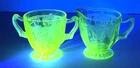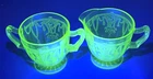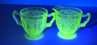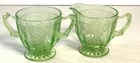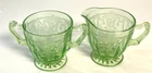The Anchor Hocking CAMEO/BALLERINA Green Cream and Sugar Set is a vintage piece from the 1930s, featuring the elegant CAMEO/BALLERINA pattern in a vibrant green color. This set is made of uranium glass, which glows under black light, adding a unique and mysterious touch to your table setting. With a glossy finish and a retro style that represents The Great Depression era, this original set is a collectible item that requires hand wash care. Perfect for adding a touch of antique charm to your kitchen decor. T hank you for looking. This item is from a smoke free home. Please view all the photos. Check out all my other items.