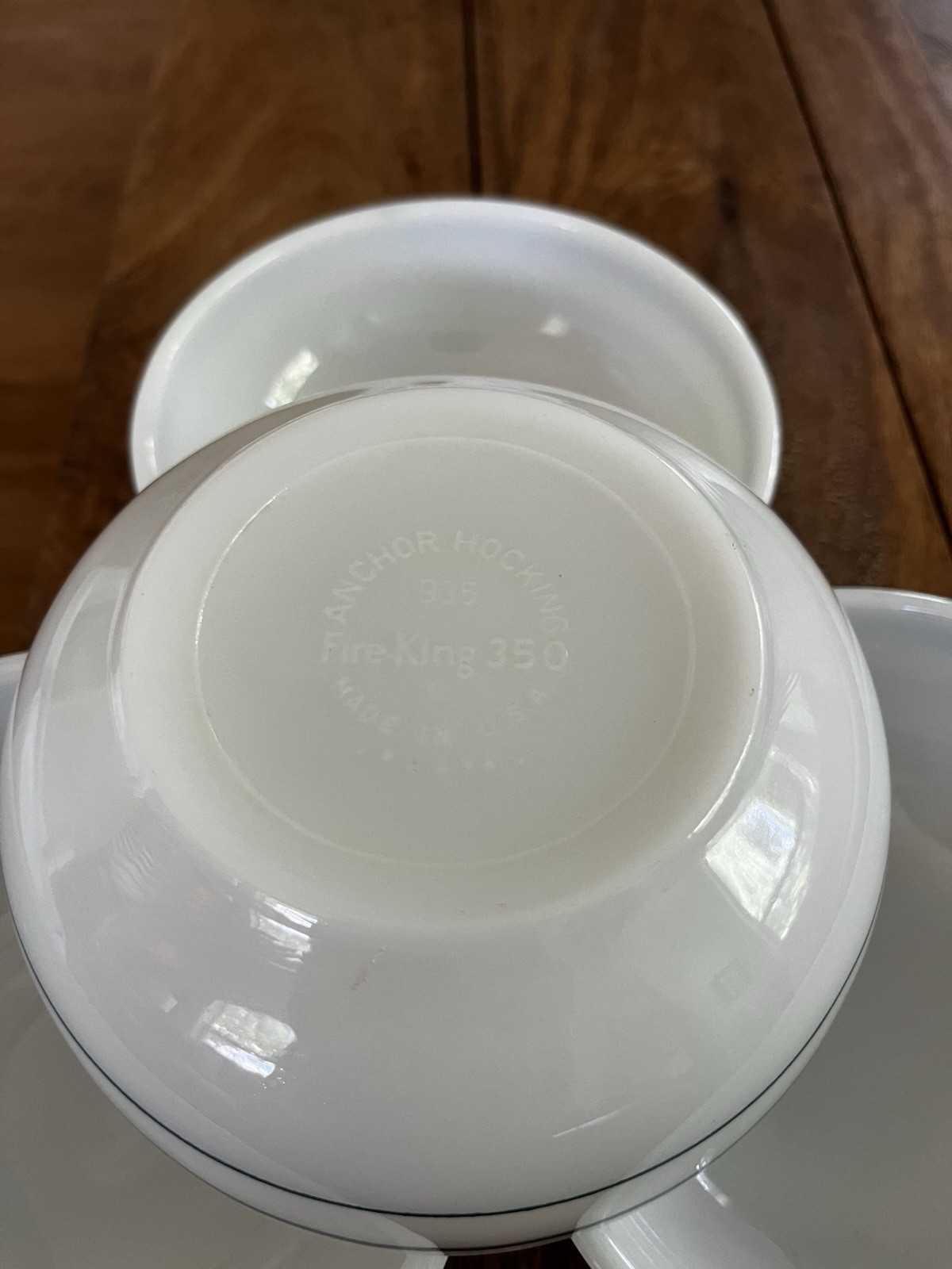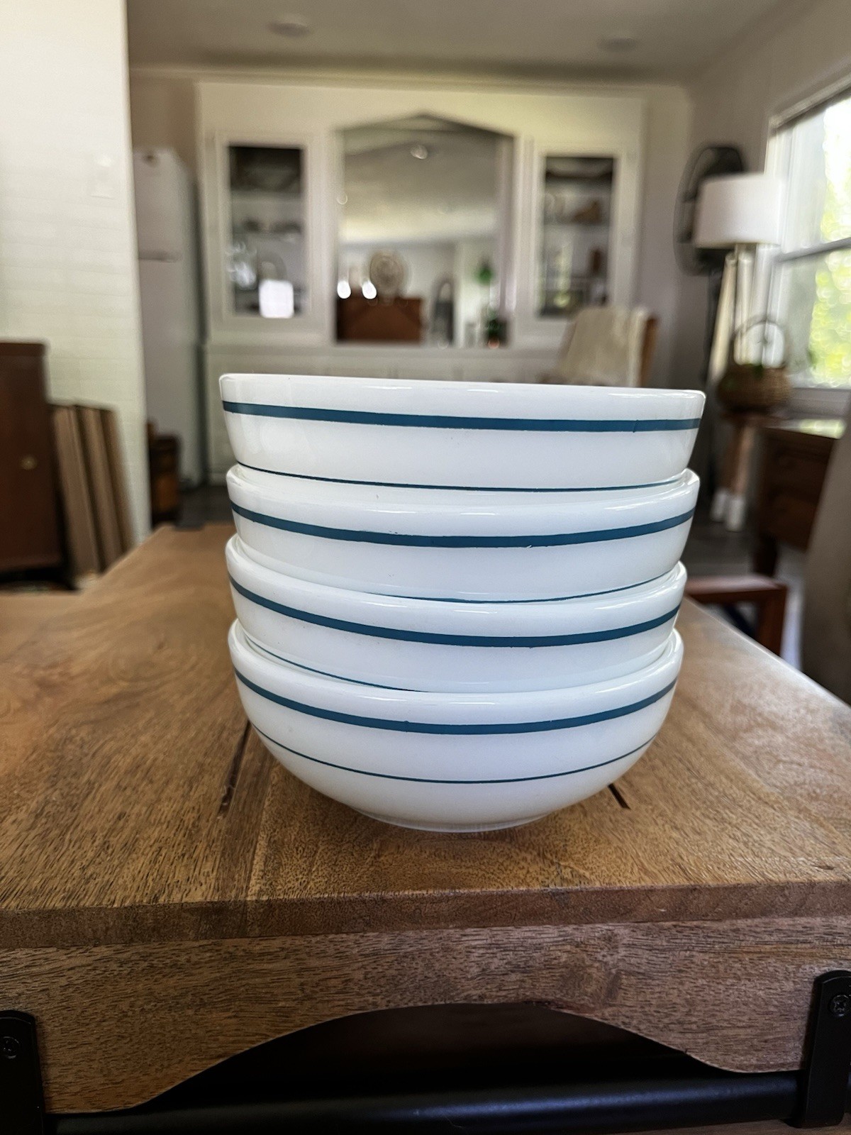 Love these vintage Fire King bowls! The teal color is so vibrant, and they're the perfect size for cereal or snacks. Great condition for being pre-owned—no chips or cracks. Shipping was fast and secure. A fantastic set for any retro kitchen!