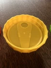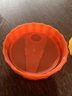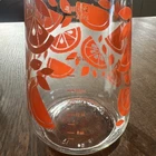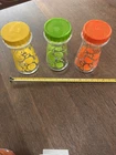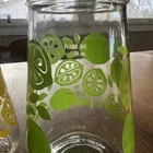 This product is a set of three vintage Anchor Hocking juice jars in green, orange, and yellow colors, featuring a retro design with an all-over pattern of limes, oranges, and lemons. Made of glass with a capacity of 24oz, these round jugs from the 1970s come with lids and are of original production style. Perfect for adding a touch of retro charm to your kitchen decor or collecting vintage kitchenware, these juice pitchers are a unique and nostalgic addition to any collection. Made in the United States, these jugs showcase the brand's signature style and craftsmanship. No cracks, chips on glass. The orange lid has a crack, see photos, it does not seem to affect the lid mechanism and I barely noticed it when I went to wrap them up. See photos as additional descriptions. All lids close and work with no issues.