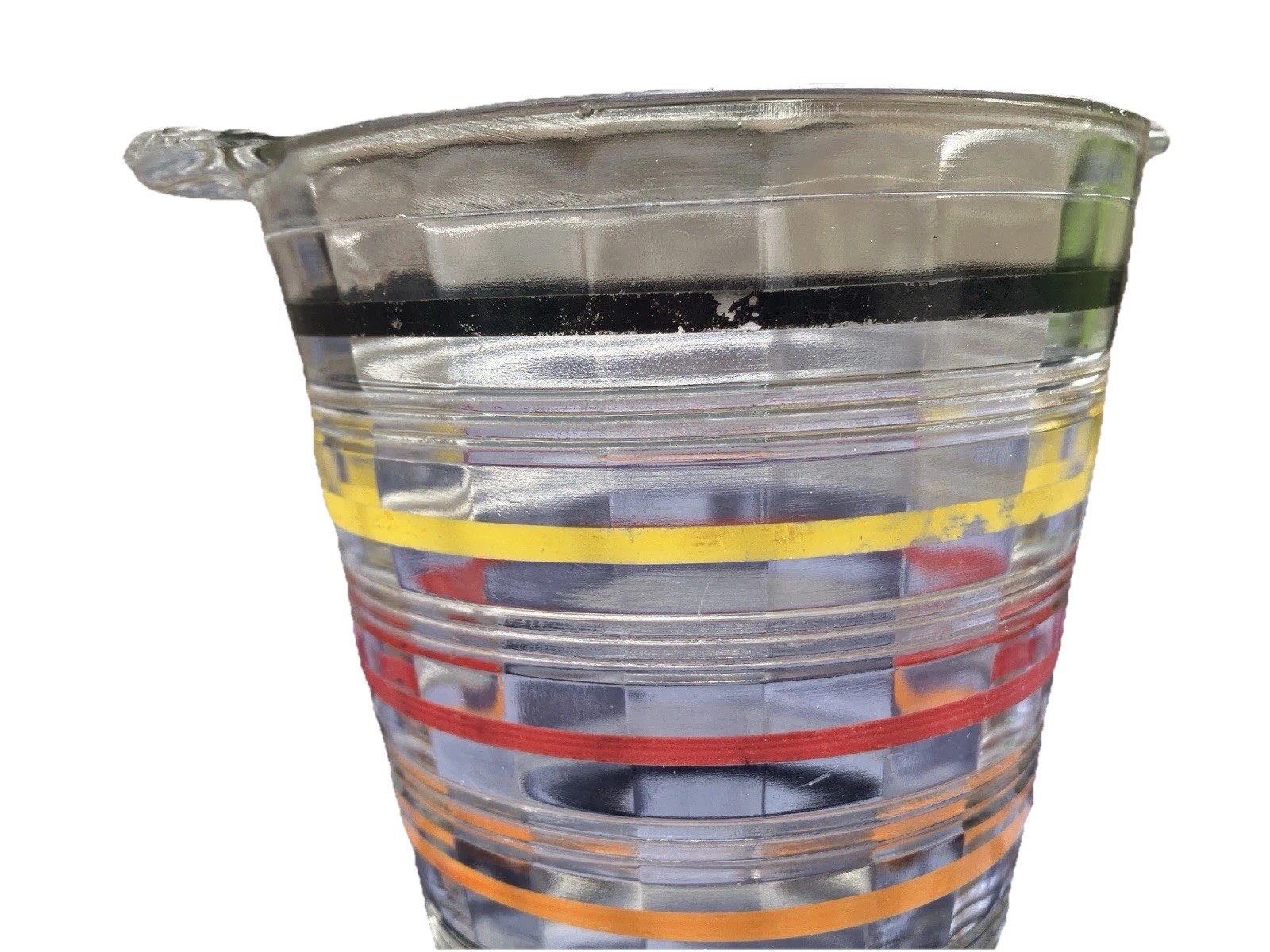 The Art Deco Anchor Hocking Color Ringed Ribbed Ice Bucket is a stunning piece of retro barware from the 1920-1949 time period. This multicolor glass ice bucket features a ribbed pattern and a handle, making it both stylish and functional. Made in the United States, this original piece showcases a unique design that adds a touch of elegance to any home or collection. With a diameter of 5 inches and a height of 5 1/2 inches, this ice bucket is perfect for all occasions and is sure to be a conversation starter in any kitchen or bar setting.