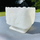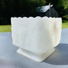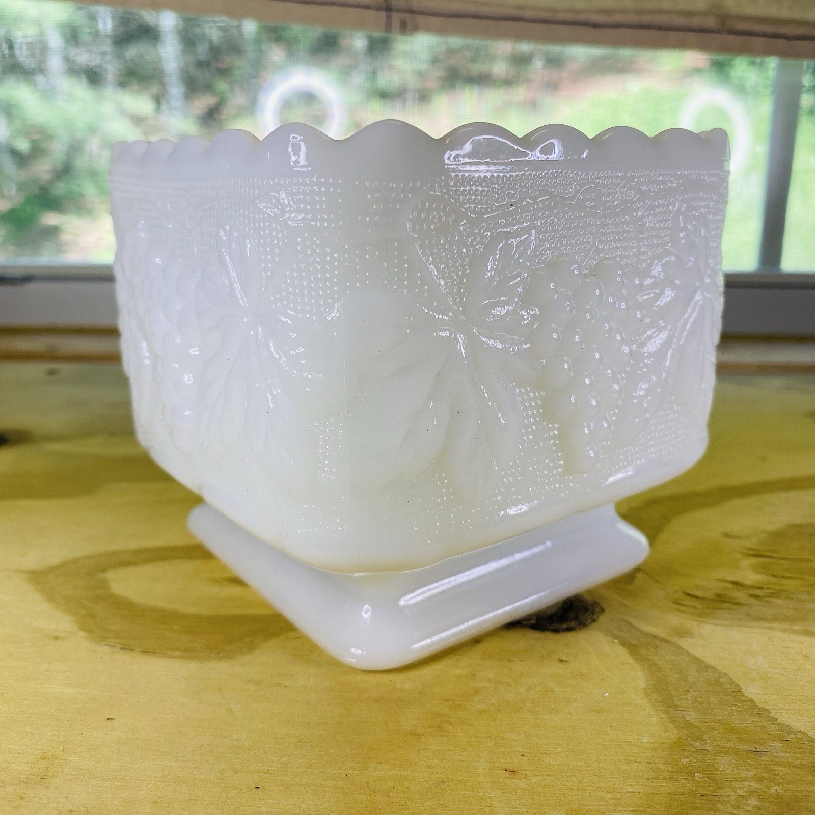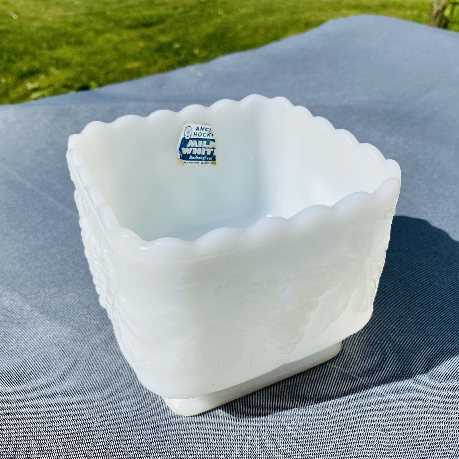Bring timeless beauty into your home with this vintage Anchor Hocking Milk White glass planter bowl, featuring the beloved Grapevine pattern with raised clusters of grapes and leaves. This stunning piece showcases a square pedestal design and an elegant scalloped rim, making it perfect as a decorative bowl, candy dish, succulent planter, or centerpiece. What makes this piece even more special? It still has its original Anchor Hocking “Milk White” label intact—a rare find that collectors love! ⸻ Details: • Maker: Anchor Hocking – Lancaster, Ohio • Pattern: Grapevine (Grape & Cable) • Color: Opaque Milk White • Size: 5 ¼ ” wide × 4” tall (approx.) • Condition: Excellent vintage condition – no chips or cracks, original label inside ⸻ Why you’ll love it: This is more than just glass—it’s a piece of American glassmaking history from the mid-20th century. Whether you’re an avid collector of milk glass or looking for a touch of vintage charm for your shelf or table, this rare square-form compote is a must-have. Ships fast & packed with care. Add a touch of nostalgic elegance to your home—buy it now before it’s gone!