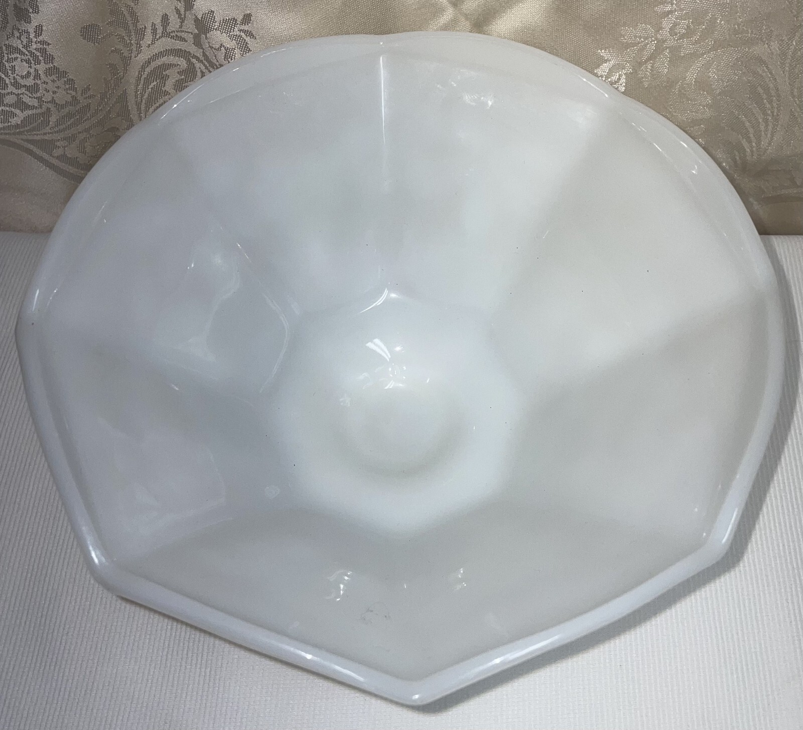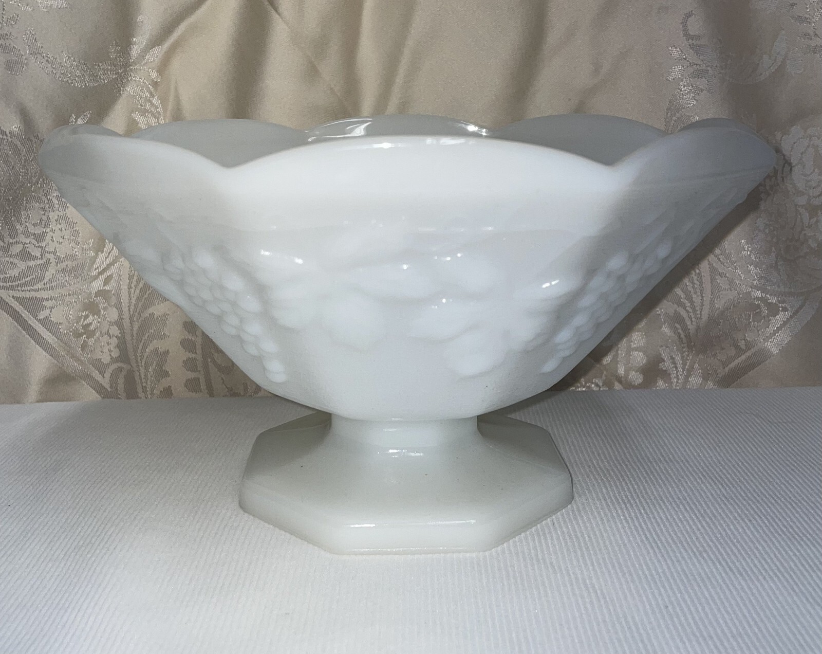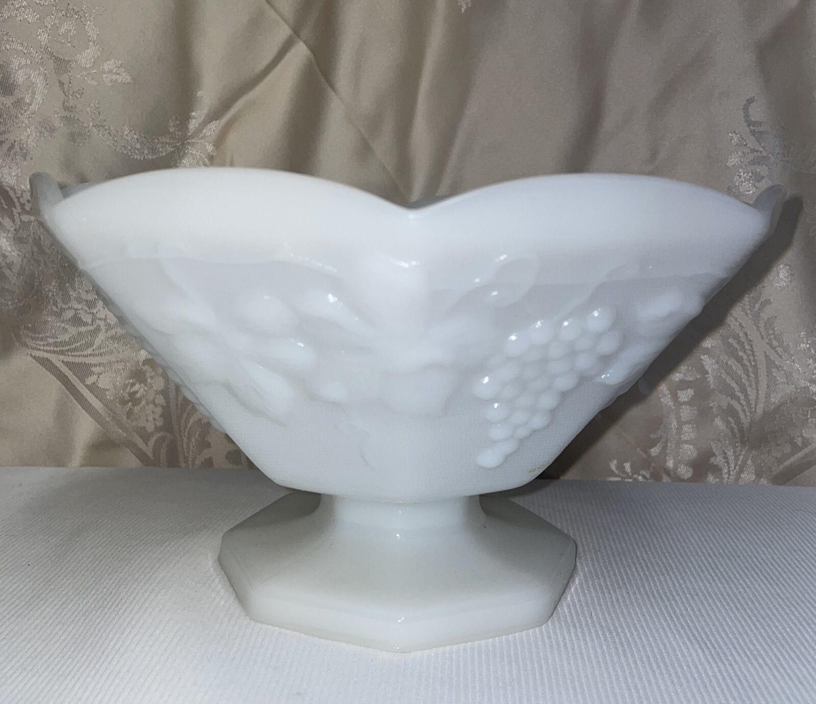 Vtg Anchor Hocking Octagonal Shape Grape & Vine Pattern Design 5 3/8 Inches High Pre-owned, excellent condition, no chips or cracks. White milk glass octagonal shape grape and vine pattern design. The bowl measures 5 3/8 inches high x 9 inches from edge to opposite edge across top opening. Great statement piece. Hand wash in warm soapy water. SOME ITEMS CANNOT BE COMBINED WITH OTHER ITEMS DUE TO UNIQUE PACKAGING CHARACTERISTICS. THERE WILL BE A NOTE IN THE LISTING WHEN COMBINED SHIPPING CANNOT BE USED. THIS CANNOT BE IN A COMBINED SHIPPING DEAL DUE TO SPECIAL PACKING NEEDS.