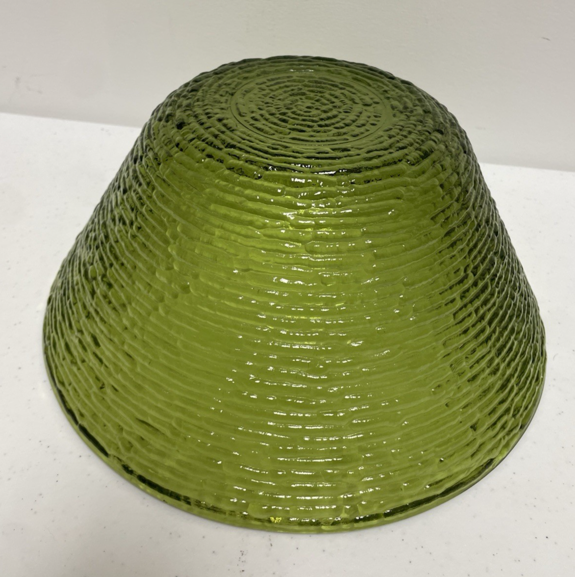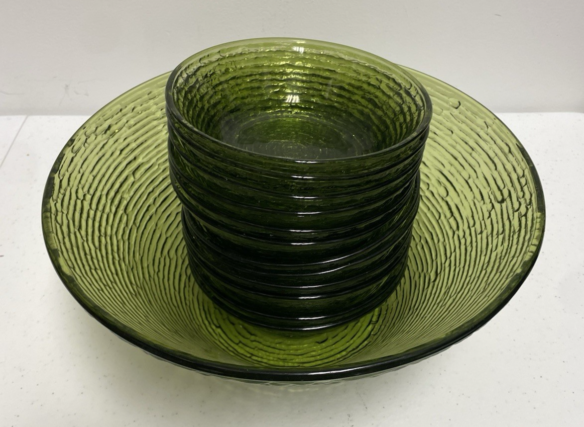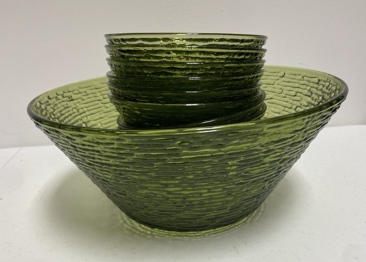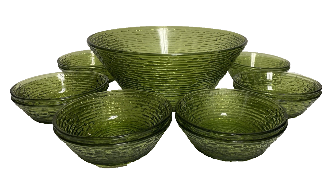 The Anchor Hocking vintage Soreno serving bowl set includes a total of thirteen pieces, with a round shape and a textured finish in a green avocado color. This mid-century modern set is made of pressed glass, with the Soreno product line marking its origin in the United States in 1966. Perfect for all occasions, this set embodies the retro charm of the era and is a stylish addition to any table setting. This set included an 11" serving bowl and 12- 6" salad/cereal bowls. All pieces are in nice MCM condition.