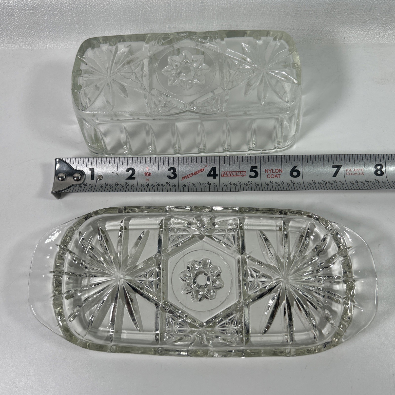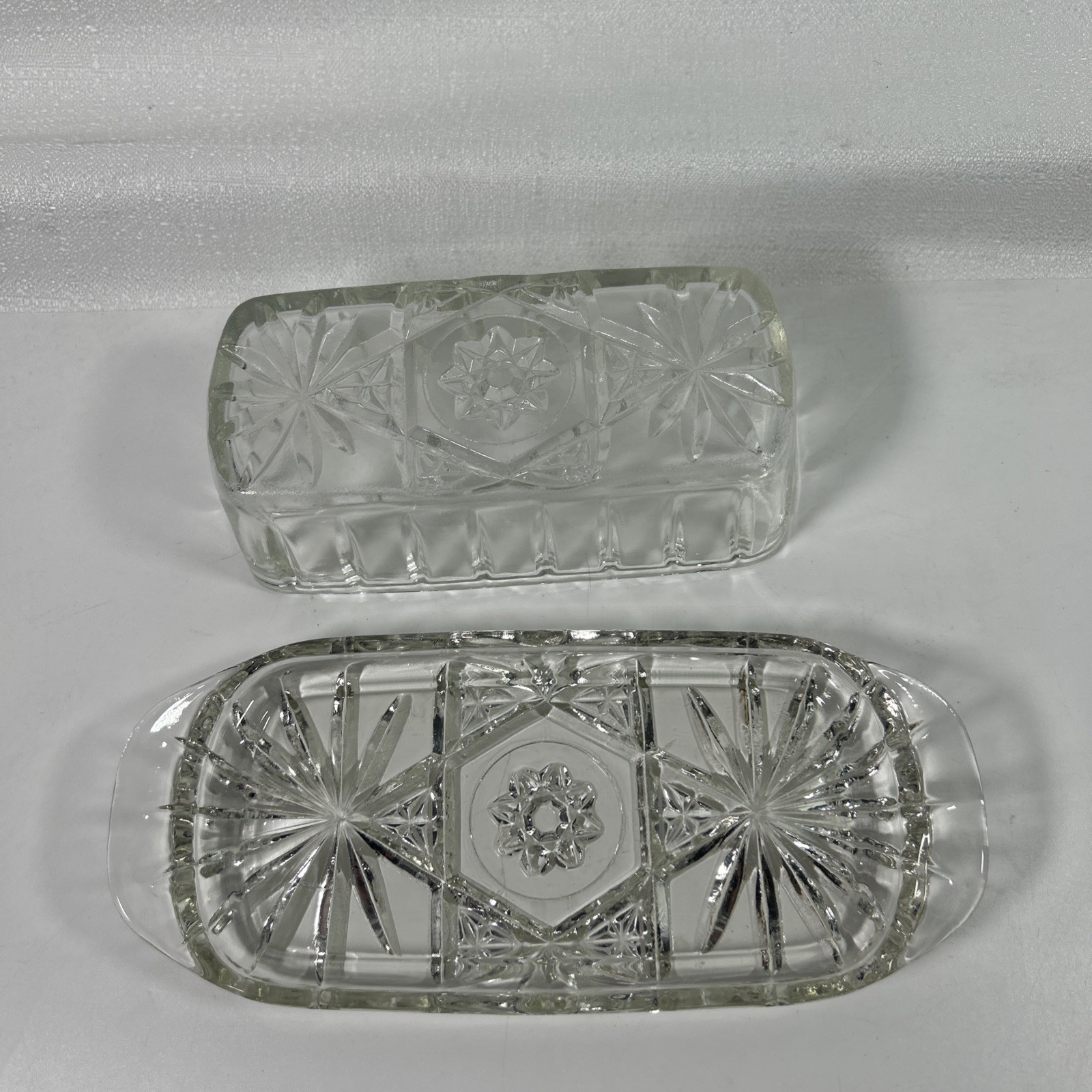 Vintage Anchor Hocking Star Covered Butter Dish EAPG Prescut. Includes 2 Pieces- Base and Cover. Pre-owned, please see photos for condition.