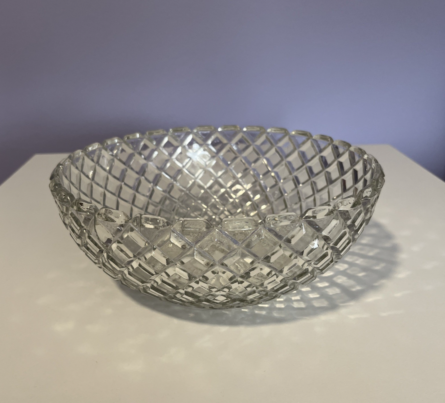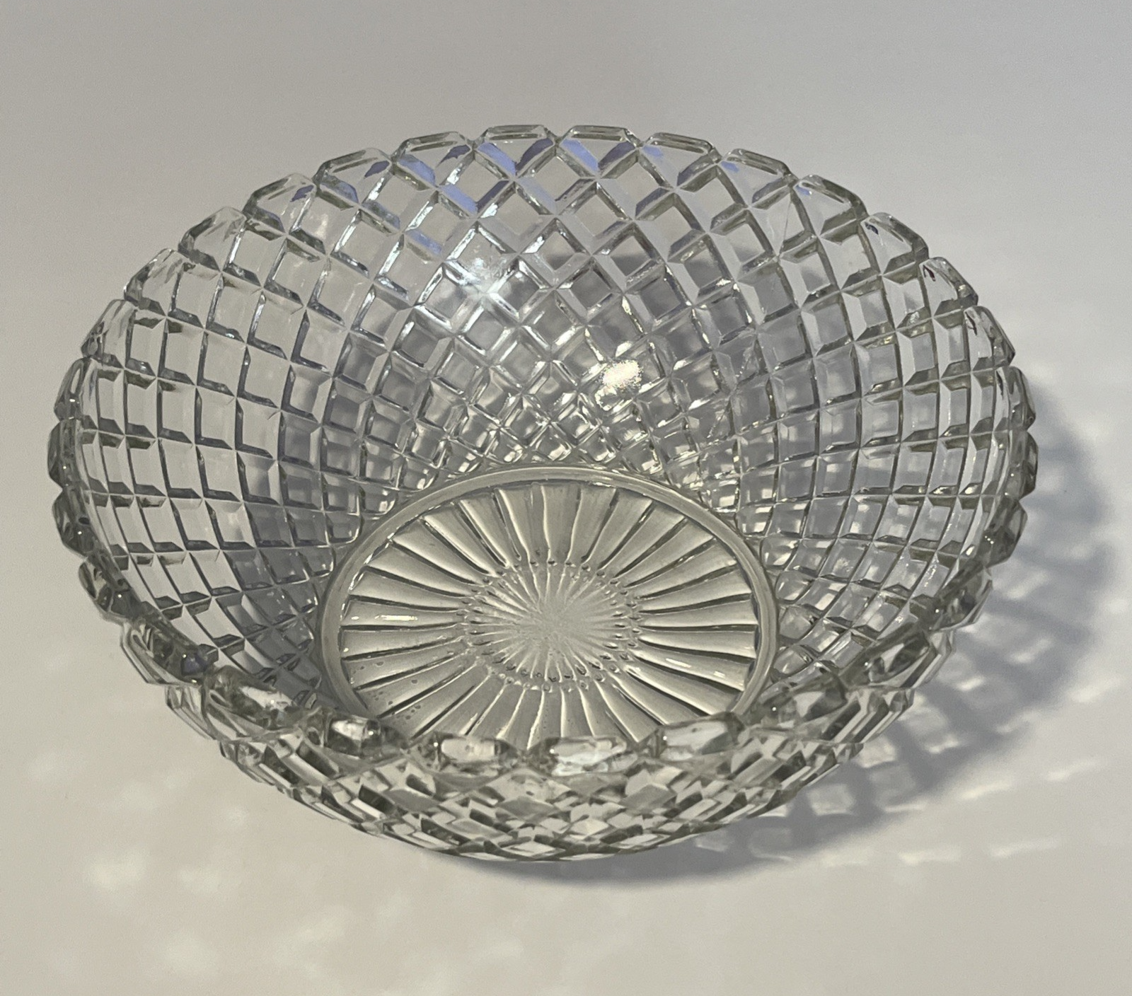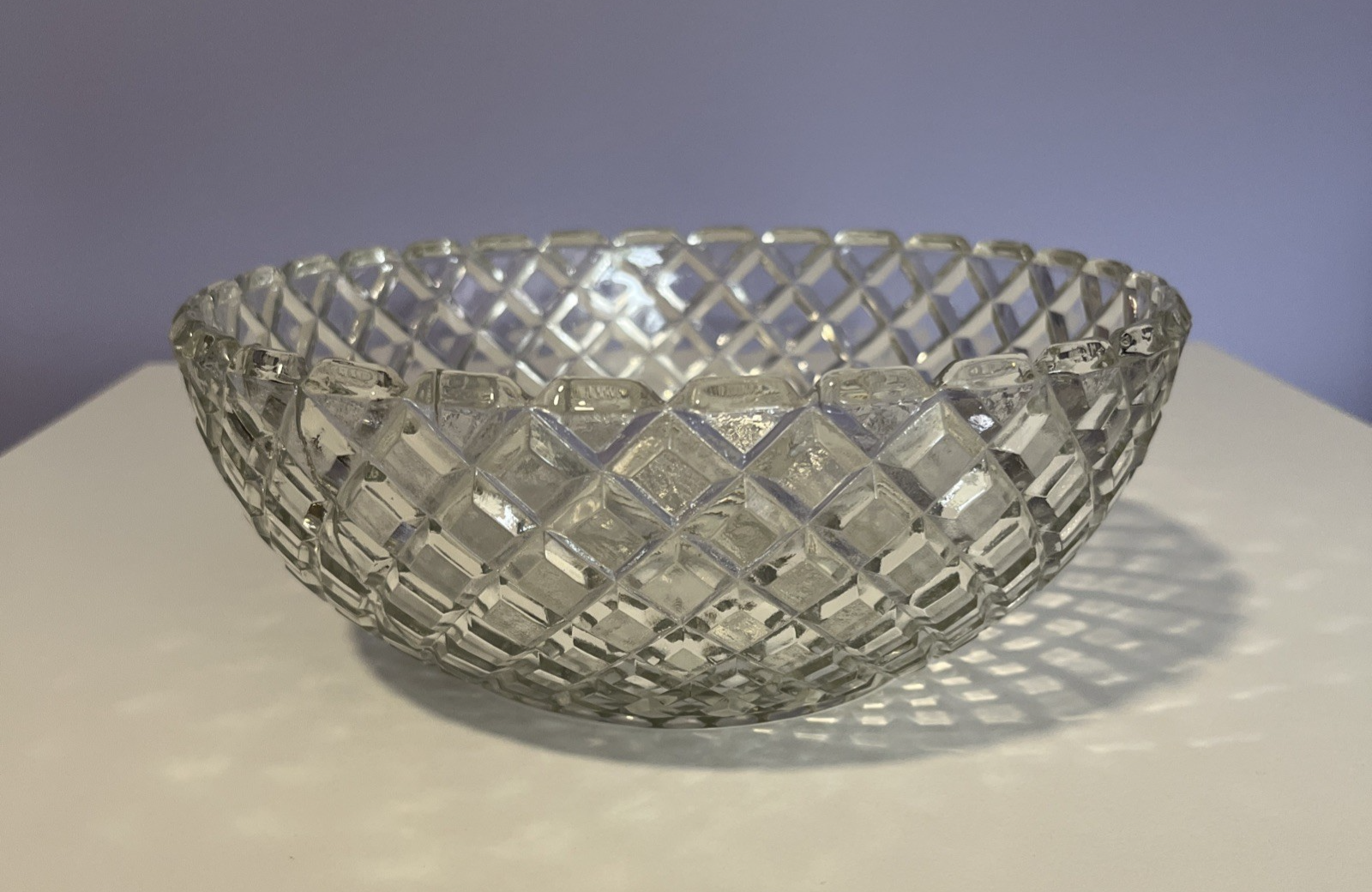 Vintage Anchor Hocking Depression Glass - Waterford Waffle pattern - Clear Salad, Serving, or Large Fruit Bowl - 8" Diameter, Stands 3.25" High This is a pretty patterned bowl which catches the light and reflects it well from the cross-hatch pattern. It would look nice on any table for serving, display or holding fruit or a low flower display. This comes from a local vintage estate and I observe no chips or cracks. Please review all pictures carefully as they are part of the description. Questions are welcome.