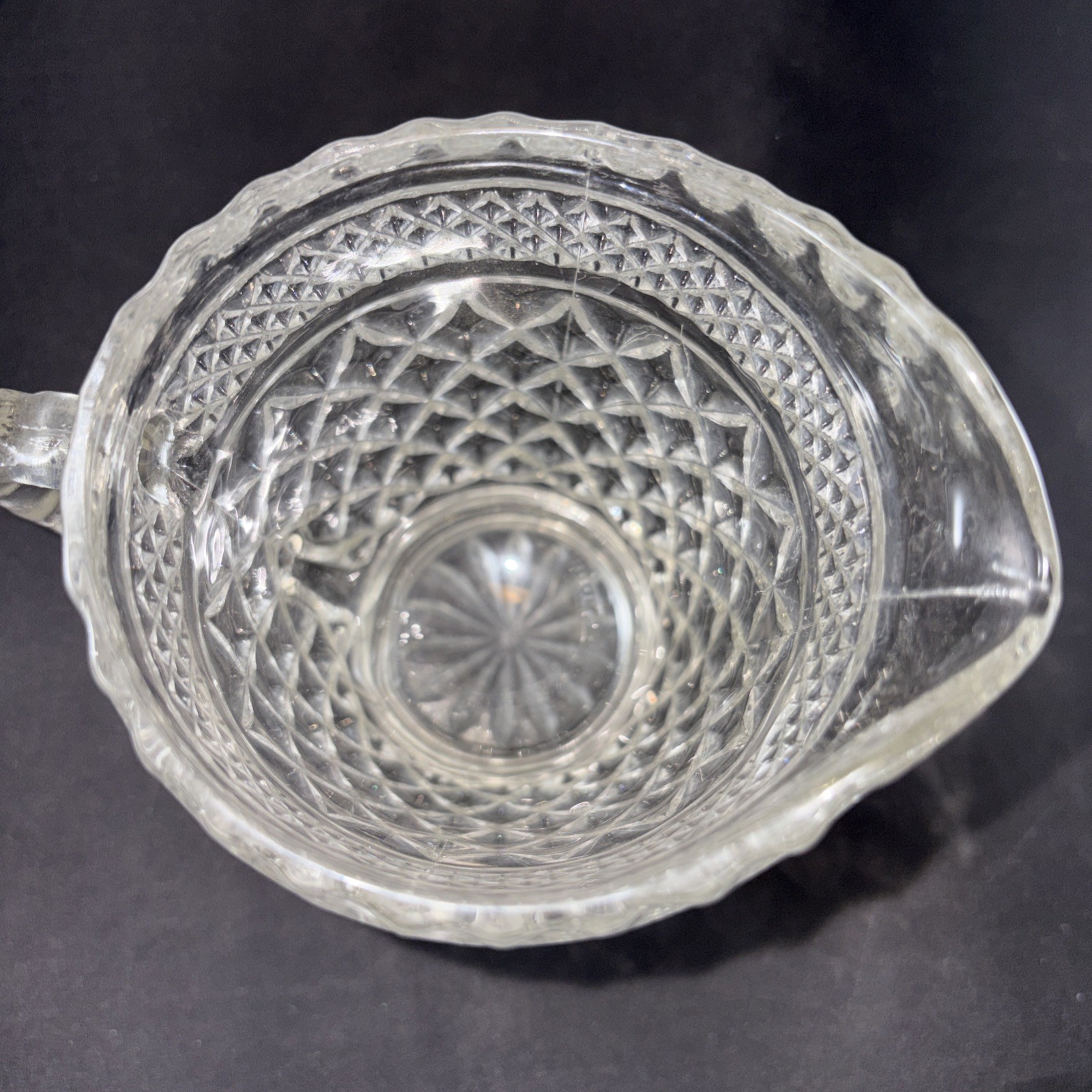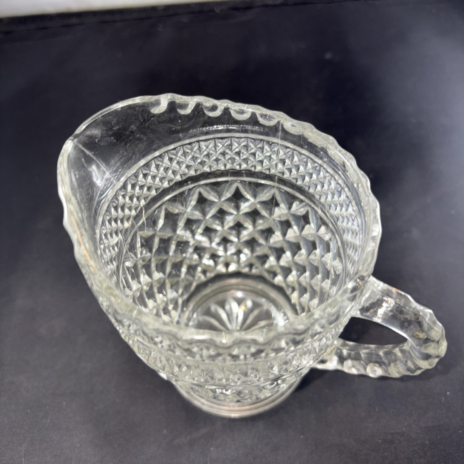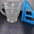 This Vintage Anchor Hocking Wexford Clear Glass Creamer Pitcher is a charming piece of mid-century modern glassware, featuring a classic diamond pattern and a glossy finish. Made in the United States, this round-shaped pitcher stands at 4.25 inches tall and has a spout to back of handle width of 4.75 inches. With its pressed glass production technique, this original Anchor Hocking Wexford creamer is a vintage collectible that adds a touch of Americana style to any kitchen or dining décor. Remember to hand wash only to maintain its pristine condition.