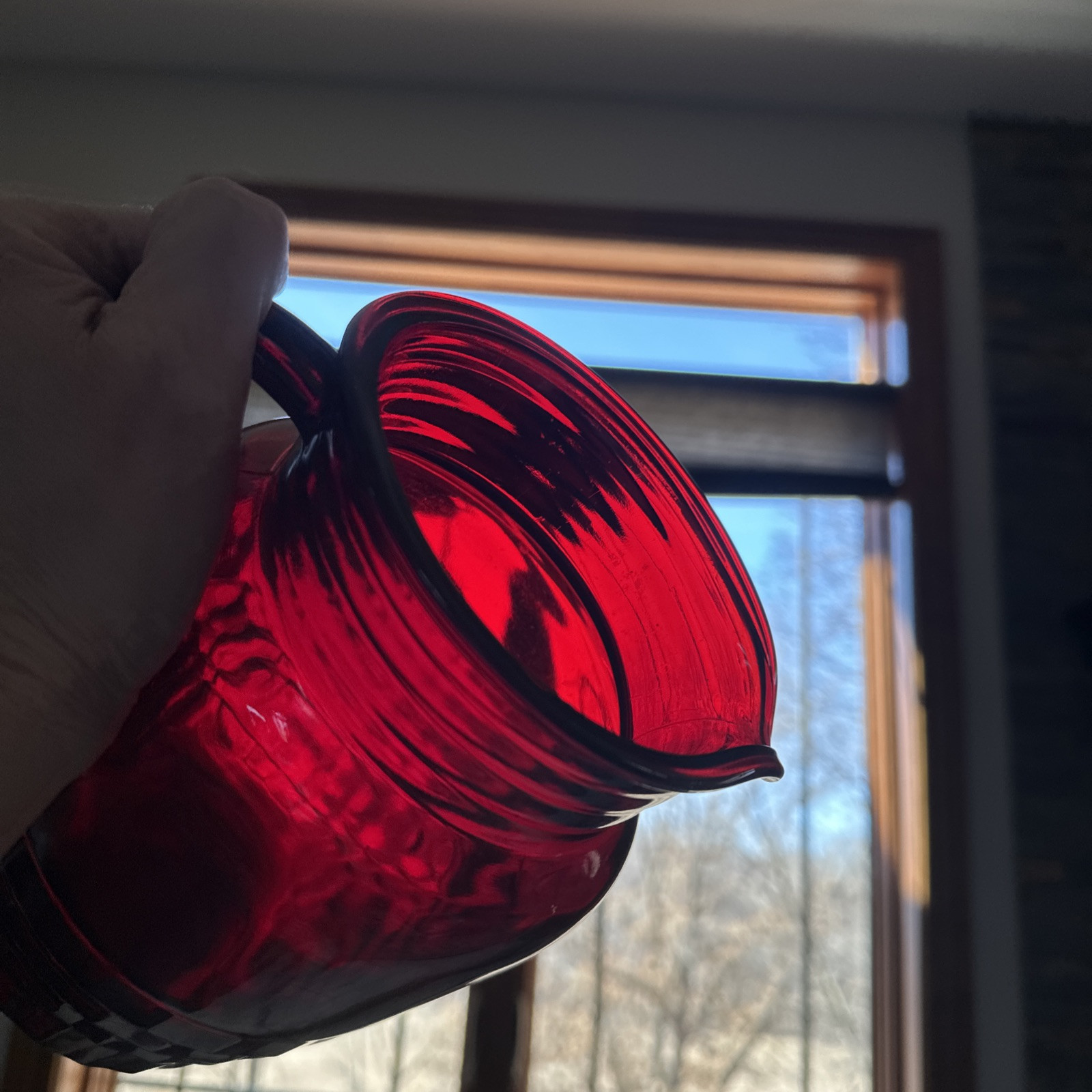 This vintage Anchor Hocking Windsor Royal Ruby Red Water Pitcher holds 64 oz. It features a round shape with a capacity of 64 oz, made of red glass in a Royal Ruby - Windsor pattern. The pitcher is from the 1940s, designed in a Mid Century style with decorative handles. Perfect for serving drinks, this American-made pitcher is both practical and stylish, adding a touch of nostalgia to any setting. Beautiful pitcher, shows normal wear as seen in pics.