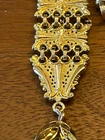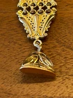 Add a touch of vintage charm to your collection with this beautiful 14k gold-filled pocket watch chain fob. Made 1900-1910, this pre-owned fob is perfect for those who appreciate unique and timeless pieces. The intricate design features a gold color and is perfect for attaching to a watch or as a standalone accessory. This fob is a great addition to any jewelry or watch collection and is sure to make a statement. It is not handmade and is vintage in nature, adding a touch of history to your accessory collection. Don't miss out on this one-of-a-kind piece! Made 1900-1910 Patented Septemer 22.03 Very Ornate Made in USA