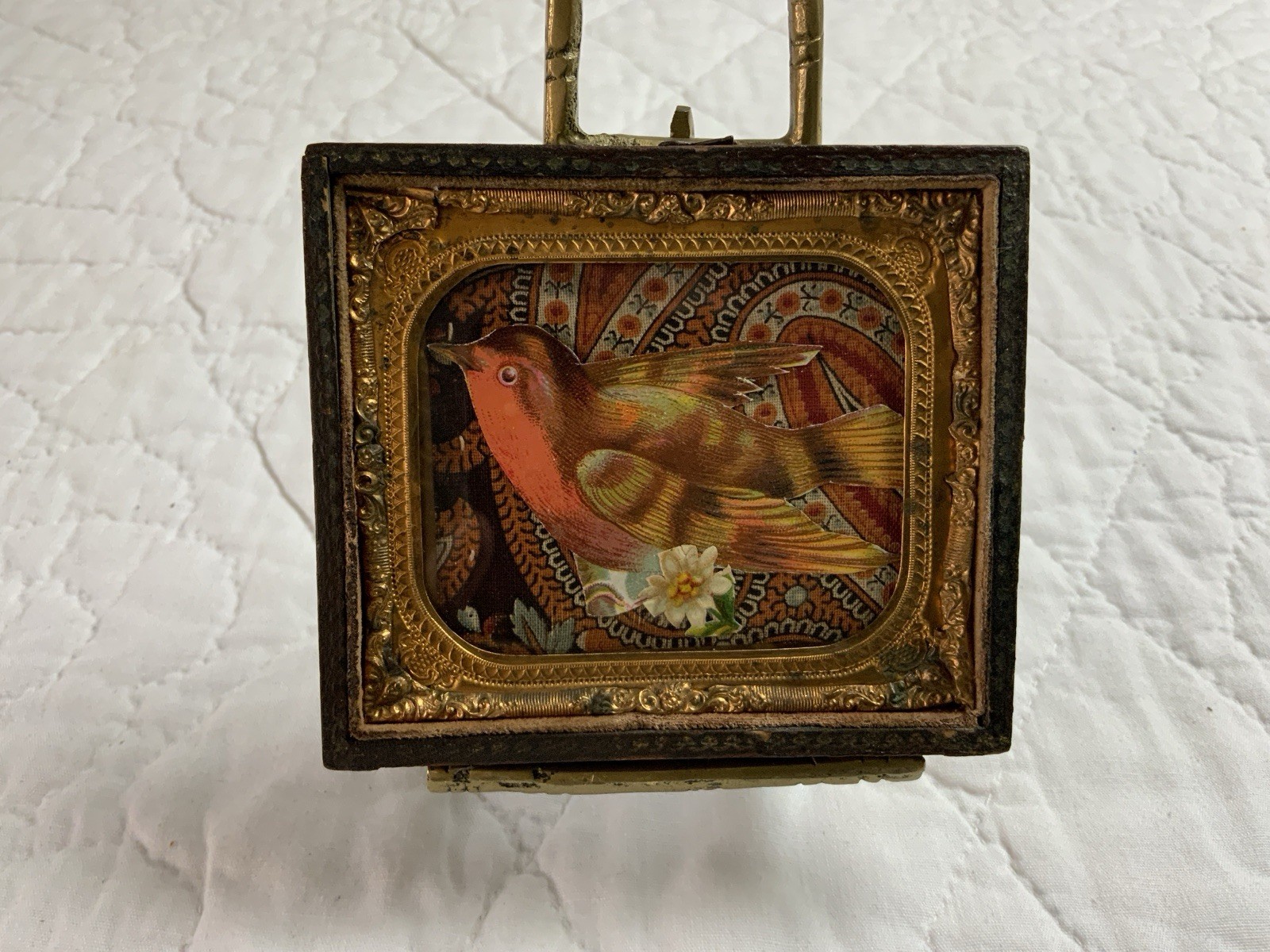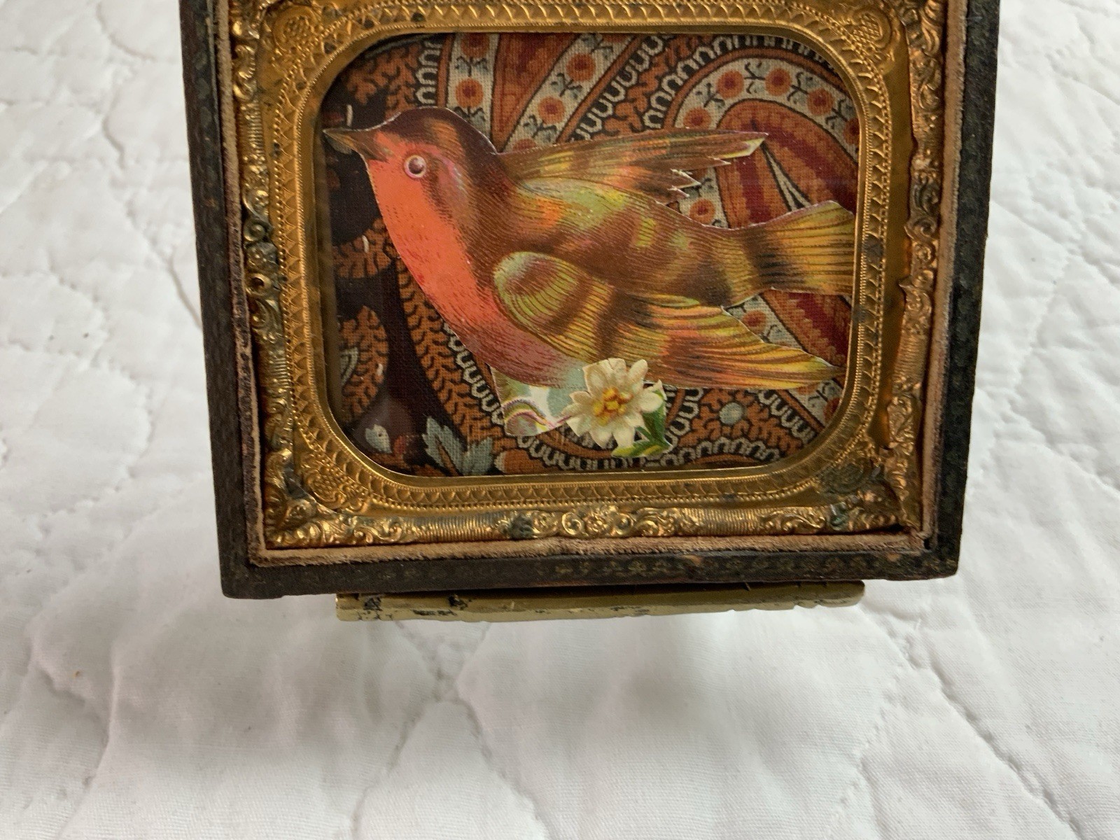 Up for sale is a vintage antique Victorian ephemera framed. Union case (half is the frame). Blackish brown. The Victorian ephemera trade card is a bird with flower. Cut to size. So cute. Made from a Victorian trade card, late 1800’s. The colors are brown, orange, grey, gold, white, yellow, multi. Original Victorian art. Antique fabric background, early fabric, floral, paisley, brown, orange. This has been put together by me. The union case and the Victorian trade card are antique/vintage. Gold detailed frame around the die cut. Under glass. Union case has been touched up by me. Measures 3 5/8” by 3 1/4” by 1/2”. Very, very good condition. Little clasp on one side. Thanks and happy shopping. I will combine shipping. Please visit my ebay store: webbsamericancounry1 for over 2000 vintage and collectible items.
