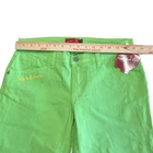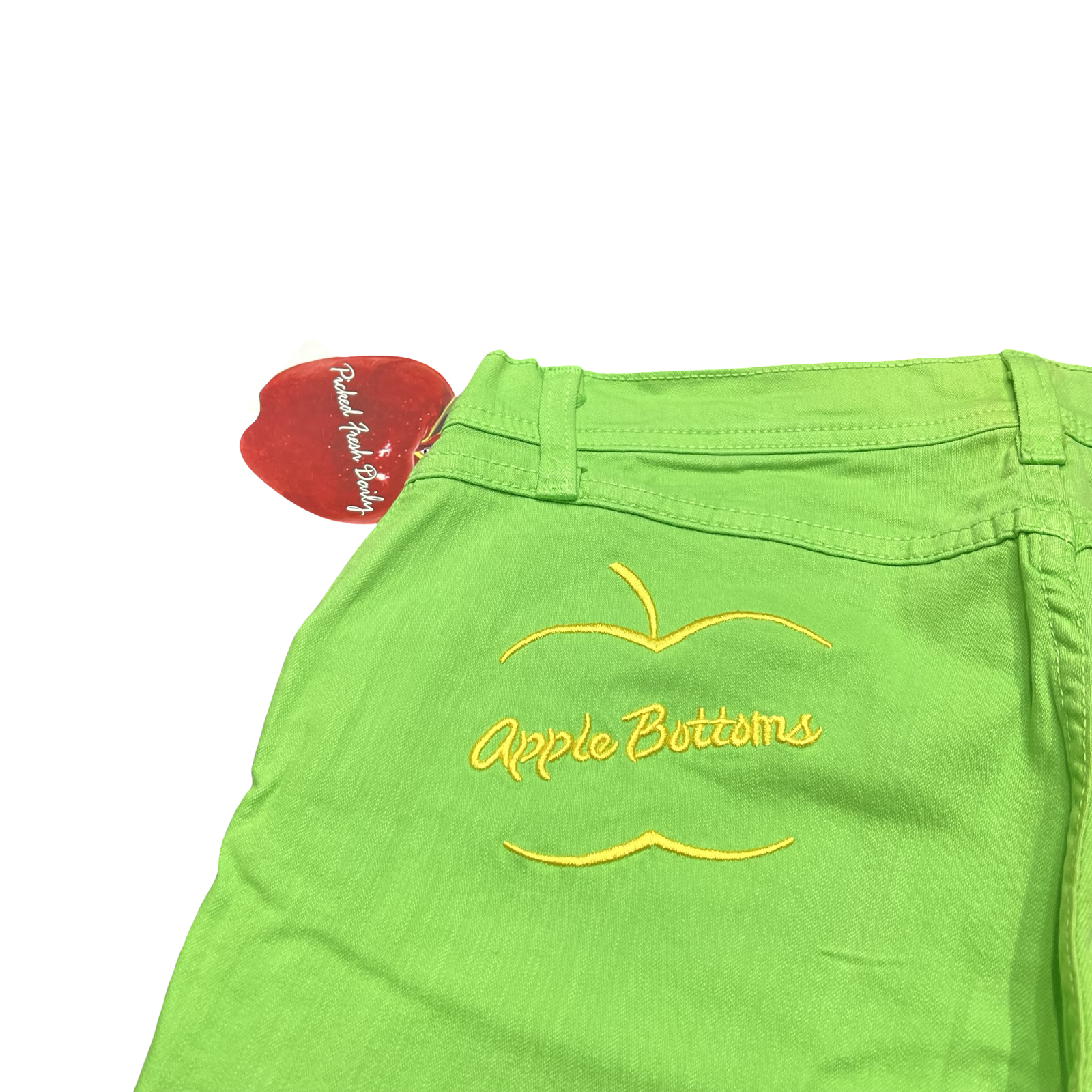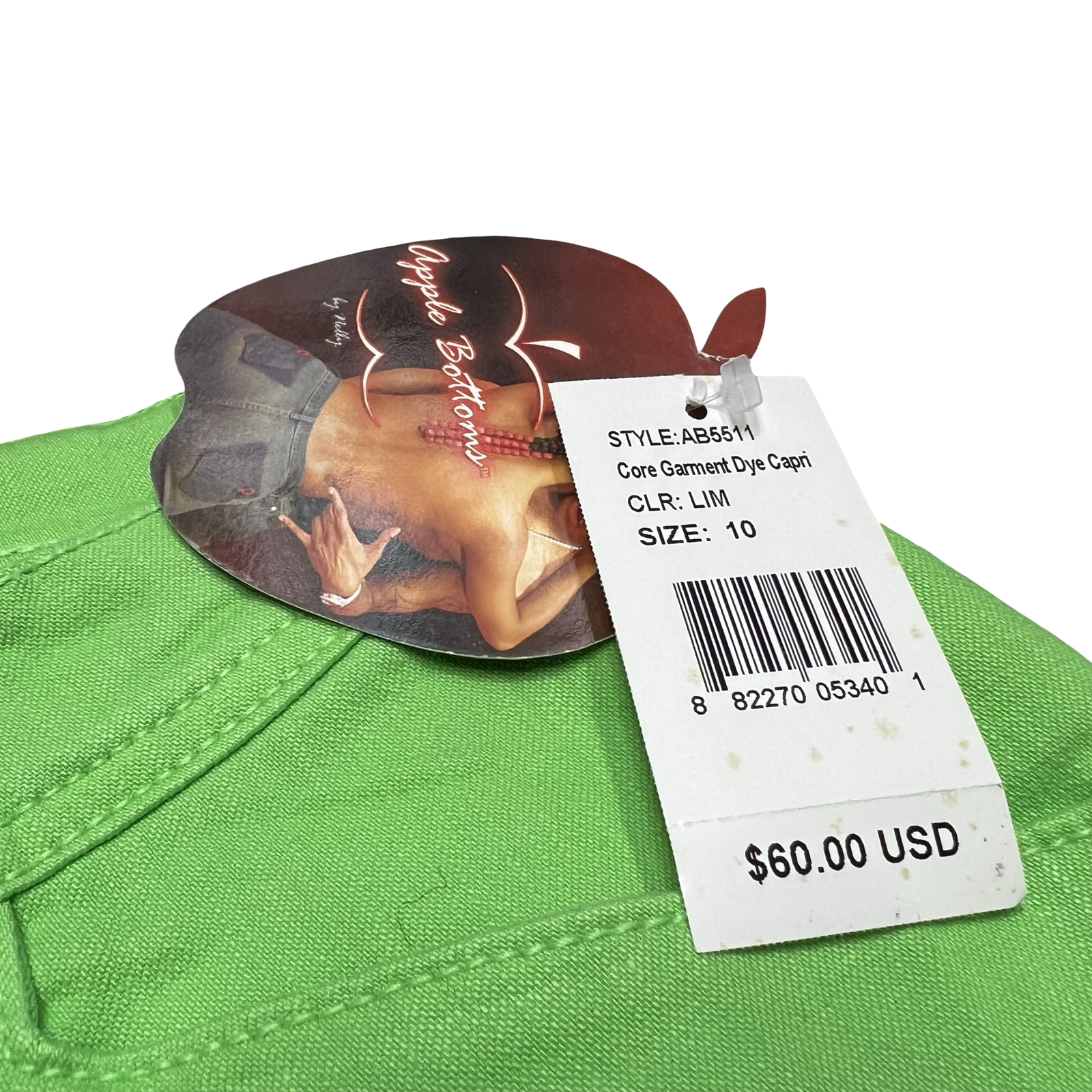 Apple Bottoms Pants Womens Size 10 Green Capri Cropped Core Garment Dye Condition: Brand New with Tags – no visible flaws Vibrant lime green color with signature yellow Apple Bottoms embroidery on back pockets and front Capri length with cuffed hems Style: AB5511, Core Garment Dye Capri Tag size: 10 (Womens) Classic five-pocket styling Apple Bottoms branded button and logo tag details Original retail price: $60.00 USD Material tag not shown Comes with original Apple Bottoms hangtag
