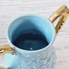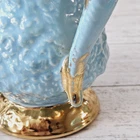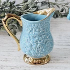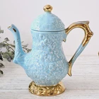 This vintage tea set has a beautiful aqua blue color with a textured gold-plated finish, making it a perfect addition to any teapot collector. * Is in used vintage condition. Does show signs of wear. Has a repair on sugar handle, teapot handle, and the teapot lid. Would make a beautiful display set. Please see all the photos as I try to detail the repairs in them. Sold as is.