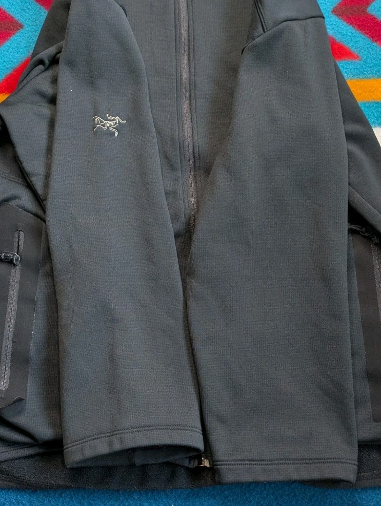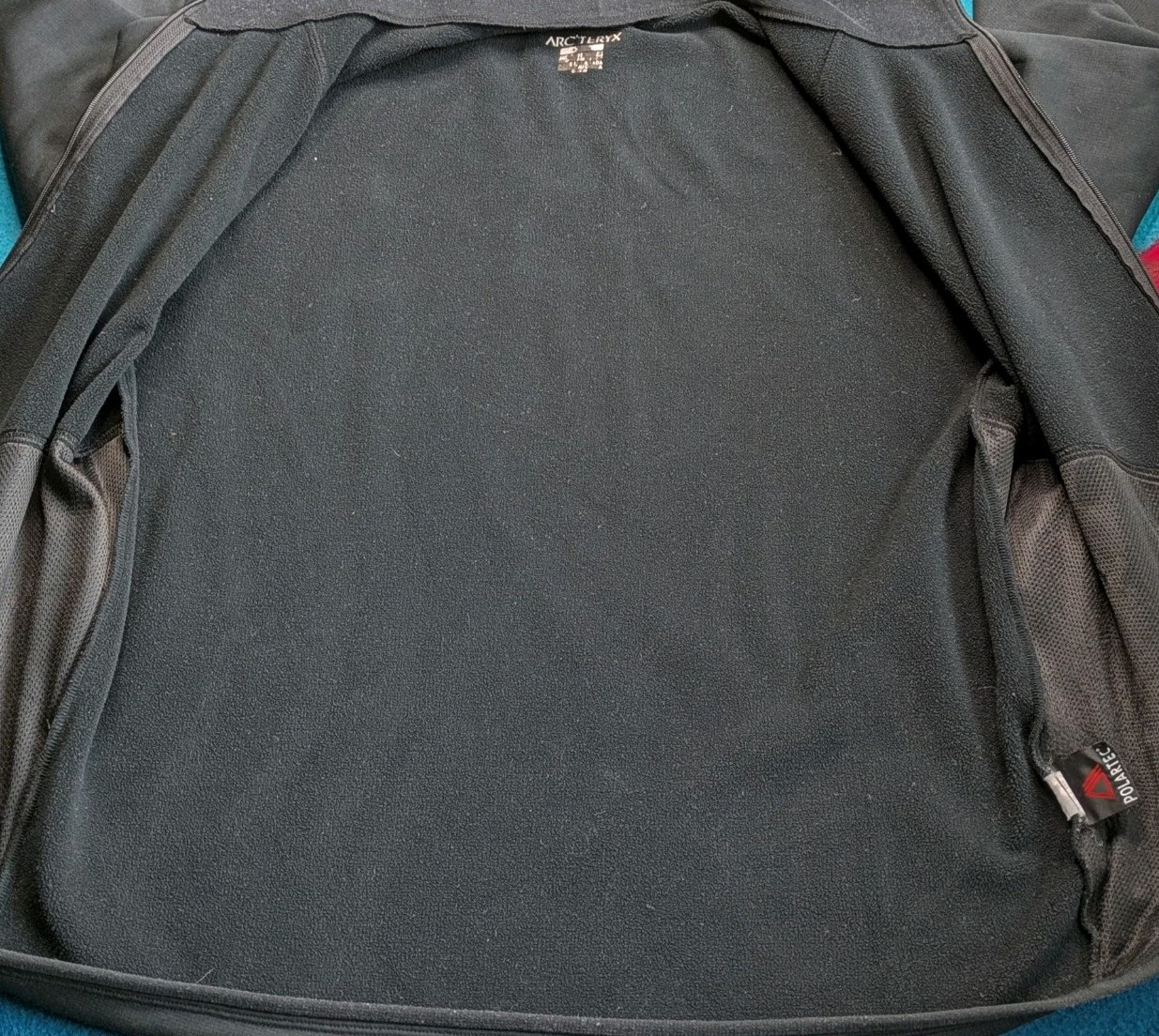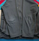 Pit to pit 21" top of shoulder to bottom 27" the last few pics show Fleece is wavy on stomach, the right pocket laminate is coming loose needs glued, backside of arms are lighter in color, fuzzies on inside fleece liner.