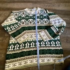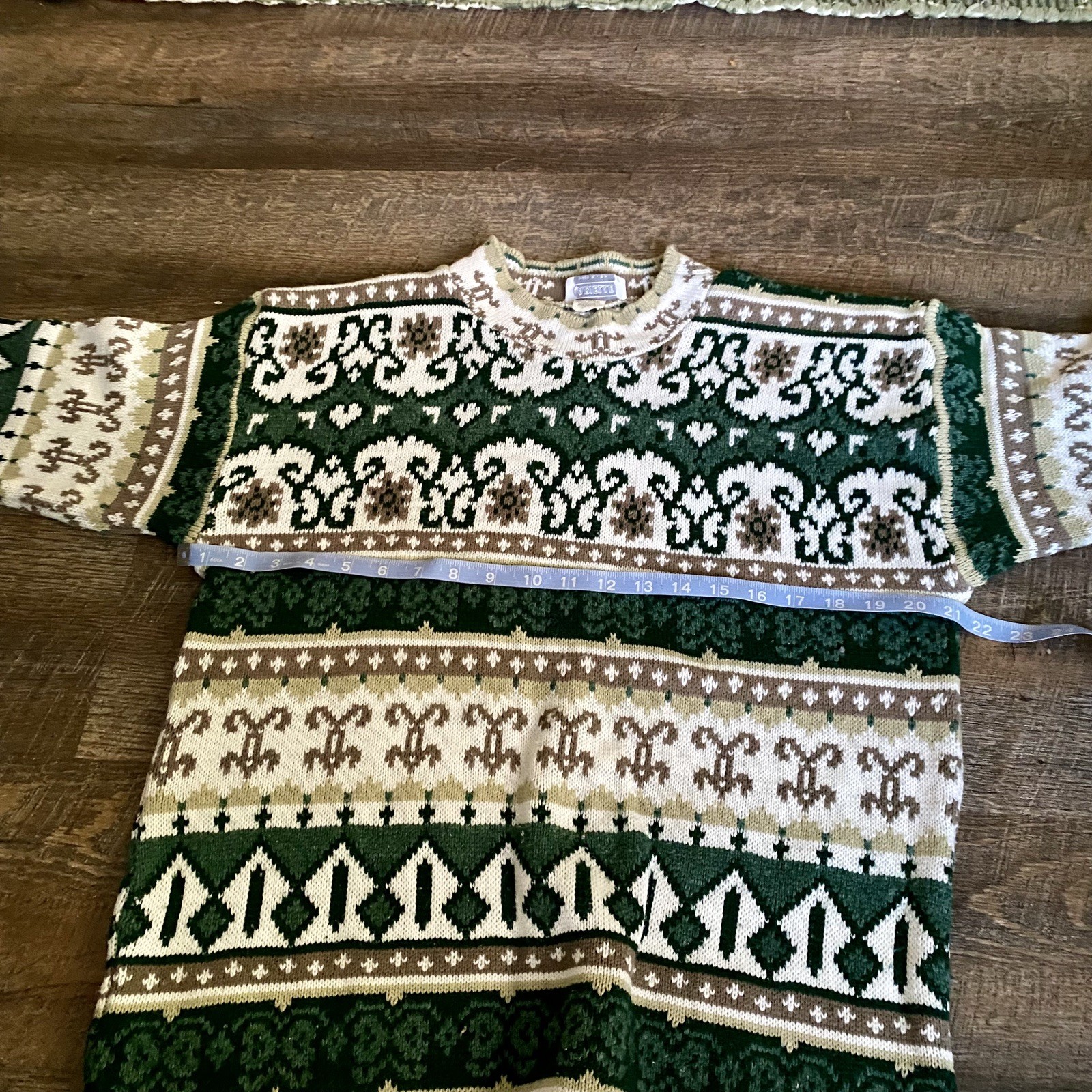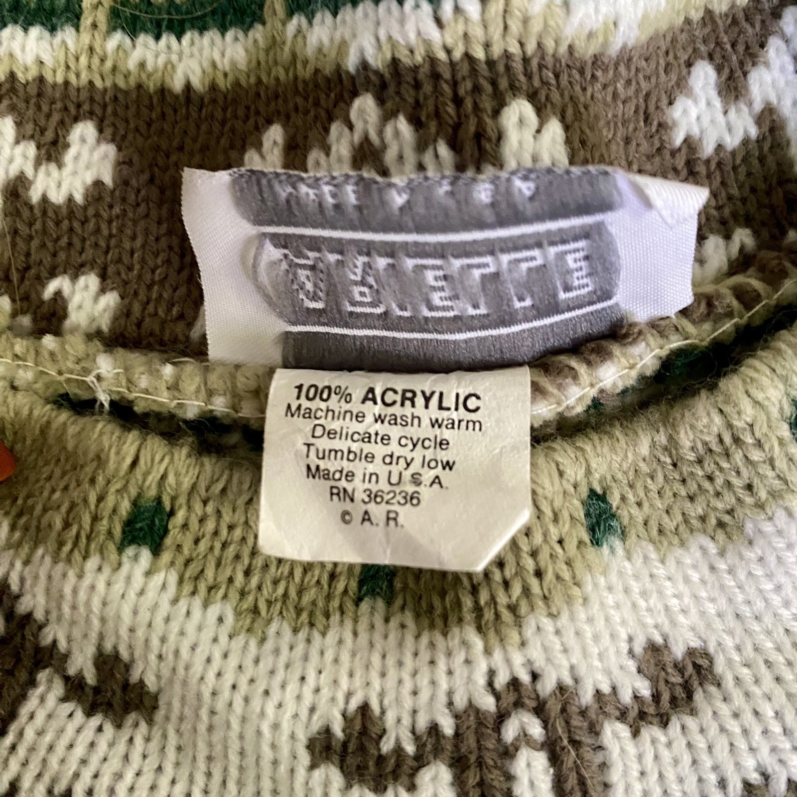 The Vintage Arielle Sweater is a stylish and cozy pullover from the 90s, featuring a classic crewneck design with a green and tan Fair Isle pattern. Made in the USA, this sweater is crafted from acrylic material and is a size medium, perfect for women looking to add a touch of retro charm to their wardrobe. The versatile green color and timeless style make it a must-have piece for any fashion-forward individual.