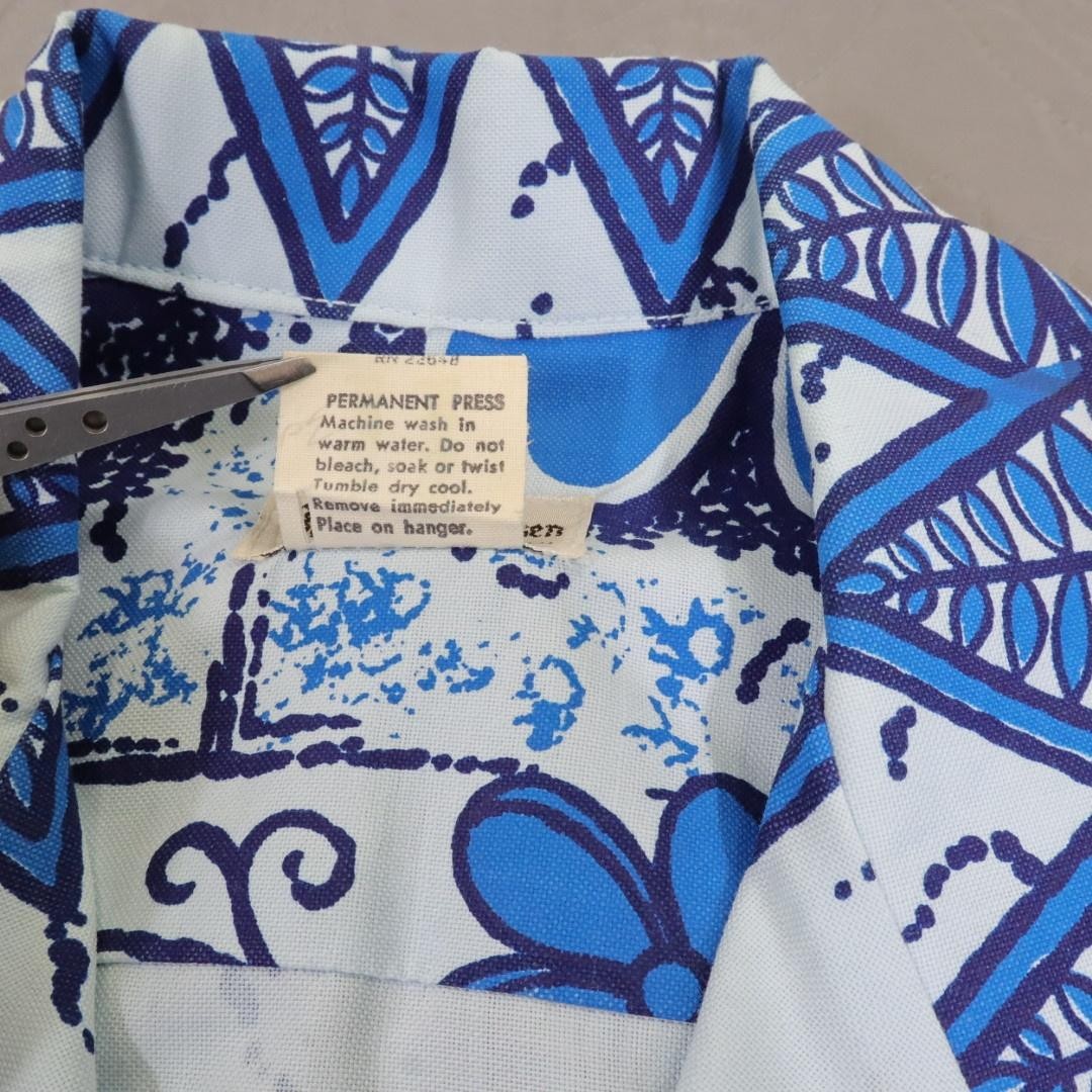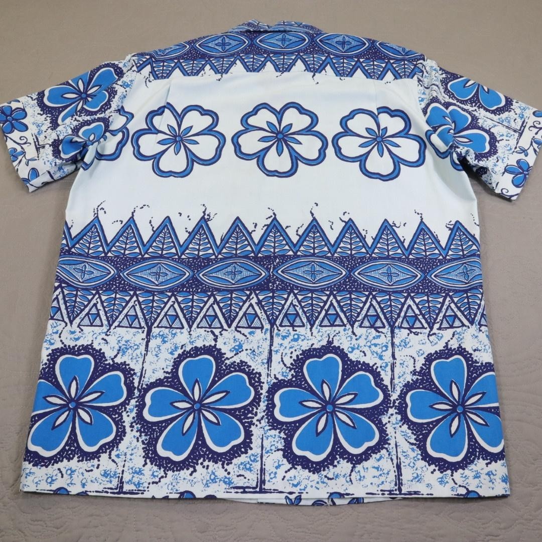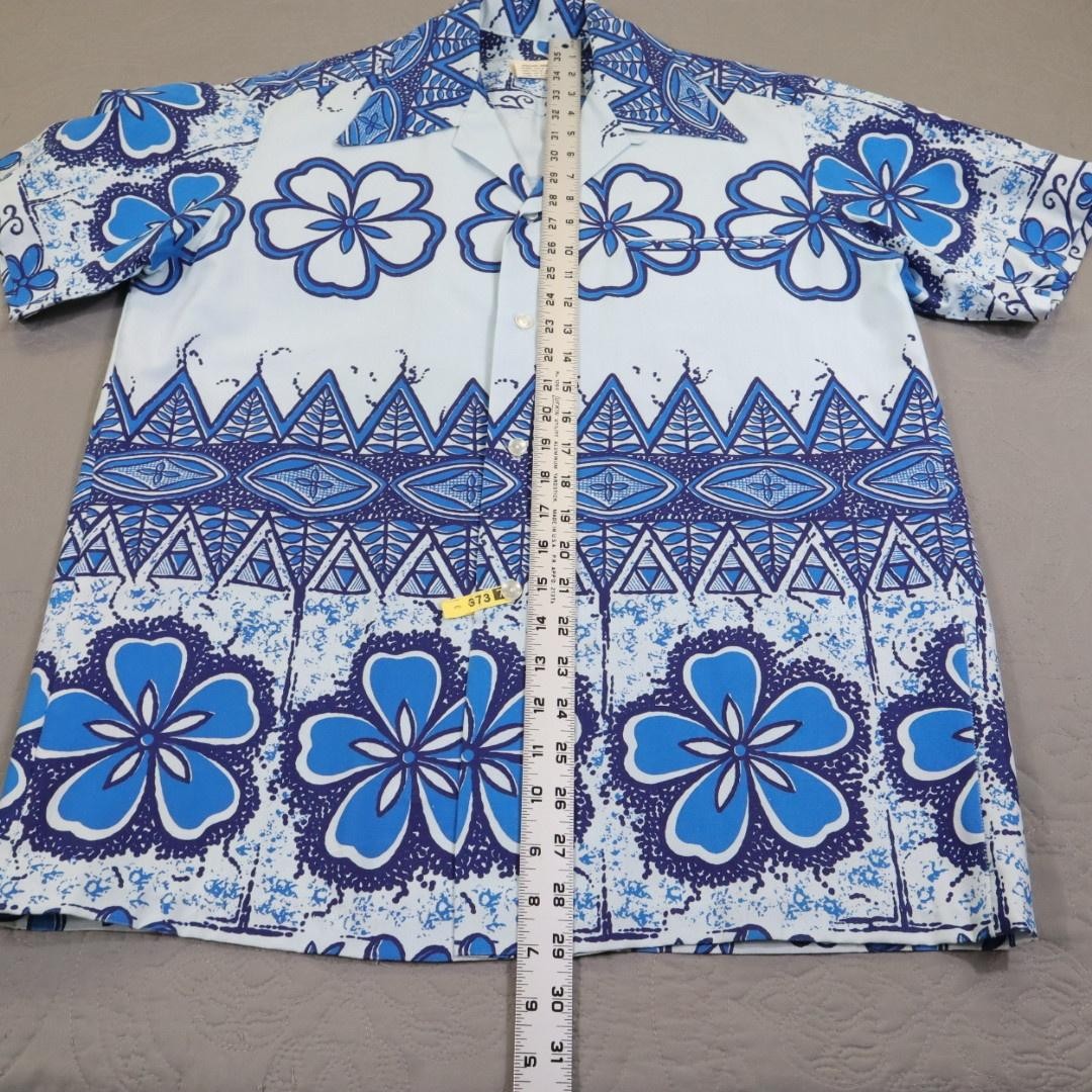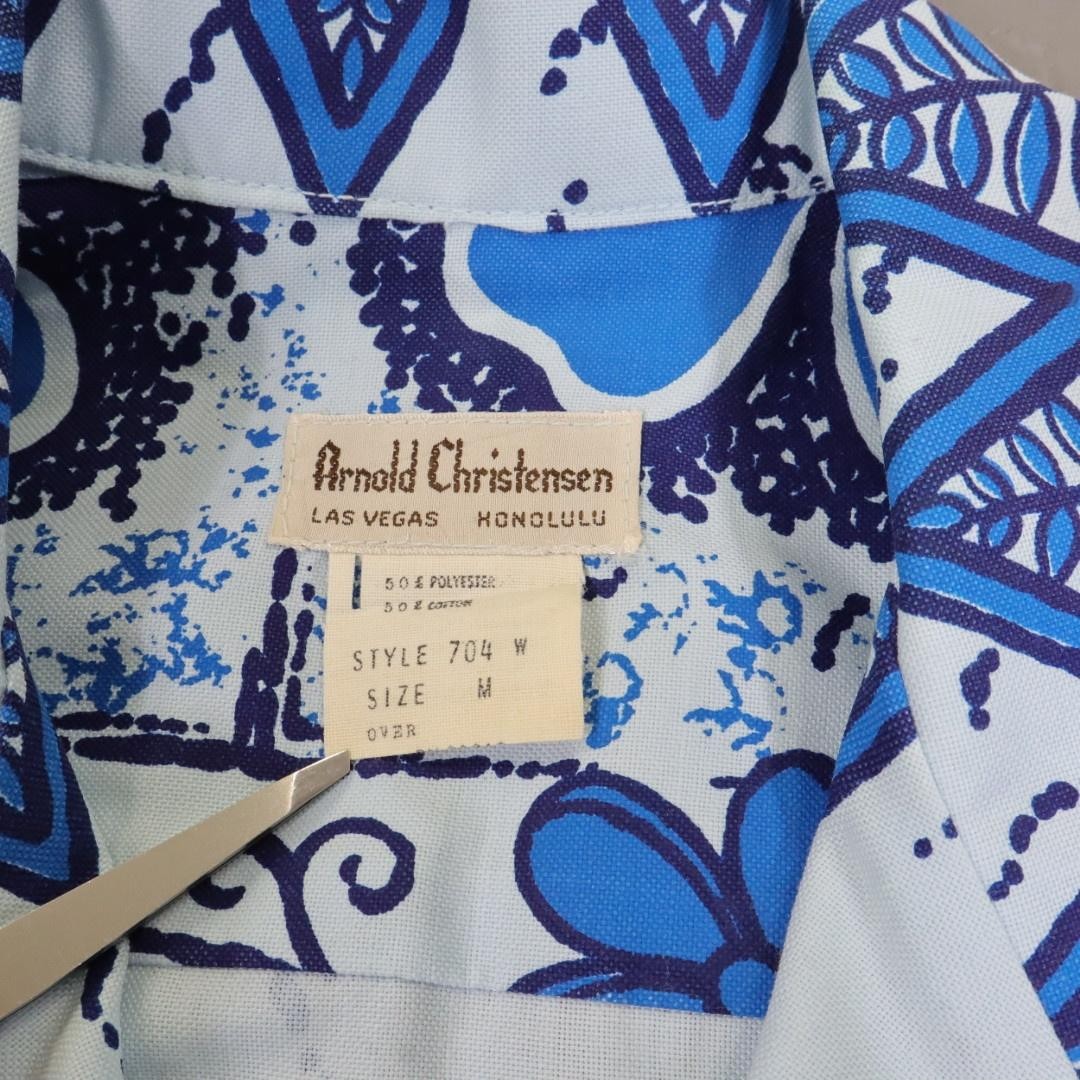 Brand: Arnold Christensen Style: Vintage men's Hawaiian button-up shirt with bold blue floral and geometric border print. Color: Light blue base with medium and dark blue tropical flower motifs and patterned bands. Size on tag: Medium Material: 50% polyester, 50% cotton
