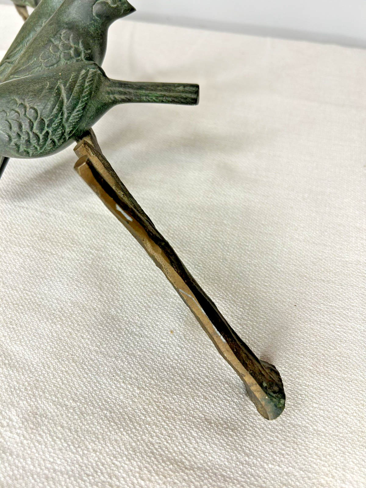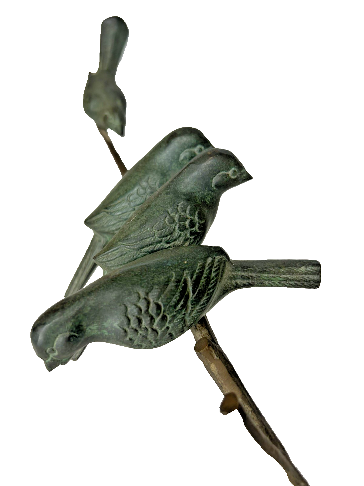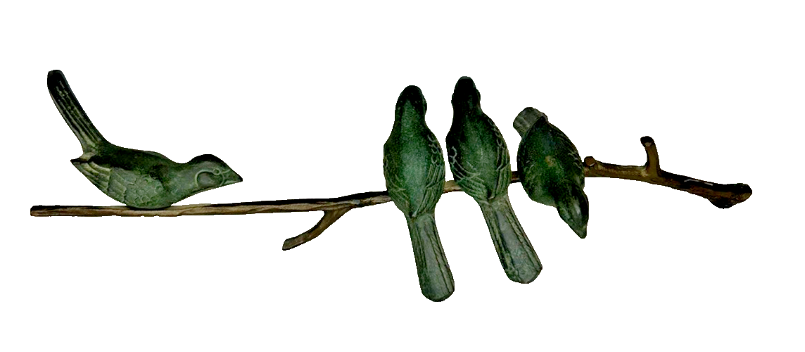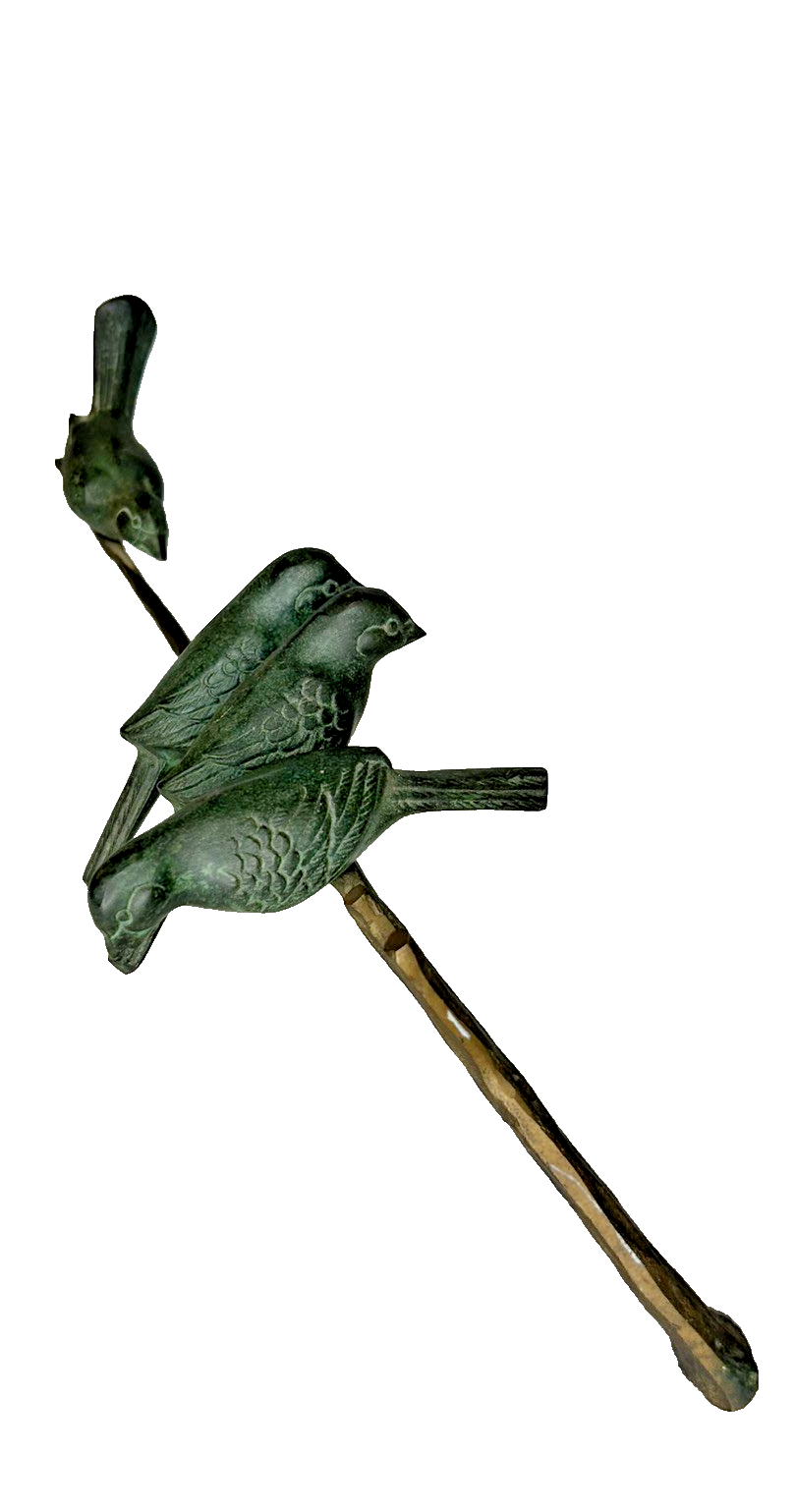 This vintage Art Deco bronze sculpture features four birds perched on a branch, with a length of 18 inches. The medium-sized sculpture is an original piece from the 1925-1949 time period, showcasing intricate details and artistic style typical of the Art Deco movement. Made of bronze, this sculpture is a unique and elegant addition to any art collection, capturing the beauty and grace of nature with a touch of historical charm. Vintage Art Deco Bronze Sculpture Four Birds On A Branch 18" Long is in excellent vintage pre-owned condition. Please review all pictures for proper assessment of its excellent vintage pre-owned condition.