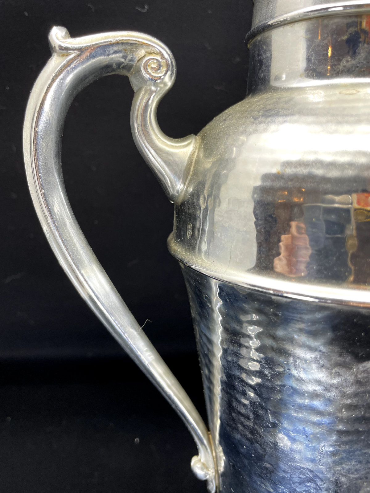 Chrome plated art deco mid century modern MCM large cocktail shaker and 5 matching silver coupes Vintage Chromium shaker has a hammered finish. It is large enough for many drinks and is very clean inside - likely never or very rarely used. We think a wedding present for my teatotaling grandparents. Shaker is stamped Chromium Plated UB (or GB?) on the bottom Set includes five matching cups (coupes or glasses) also with a hammered finish. Cups are stamped 'Keystoneware Patent pending' on the bottom. Shaker is 12" tall Cups are 5" tall Great condition and will look fabulous on your bar car! Any questions please ask!