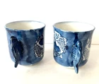 Vintage Asian 2 Blue Cups Hand Painted With Fish Handles Blue Signed