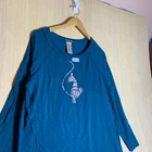 This vintage Baby Phat shirt is in size 2X and features a solid blue color with a graphic print on the front. The shirt has a crew neck and long sleeves with a pullover closure, making it easy to wear. Made from cotton knit fabric, it has cap sleeves with button, beaded, and rhinestone accents, giving it a unique and stylish look. The shirt has a hipster, Y2K vibe and is suitable for various occasions including casual wear, parties, and work. It is a comfortable and breathable piece suitable for all seasons.