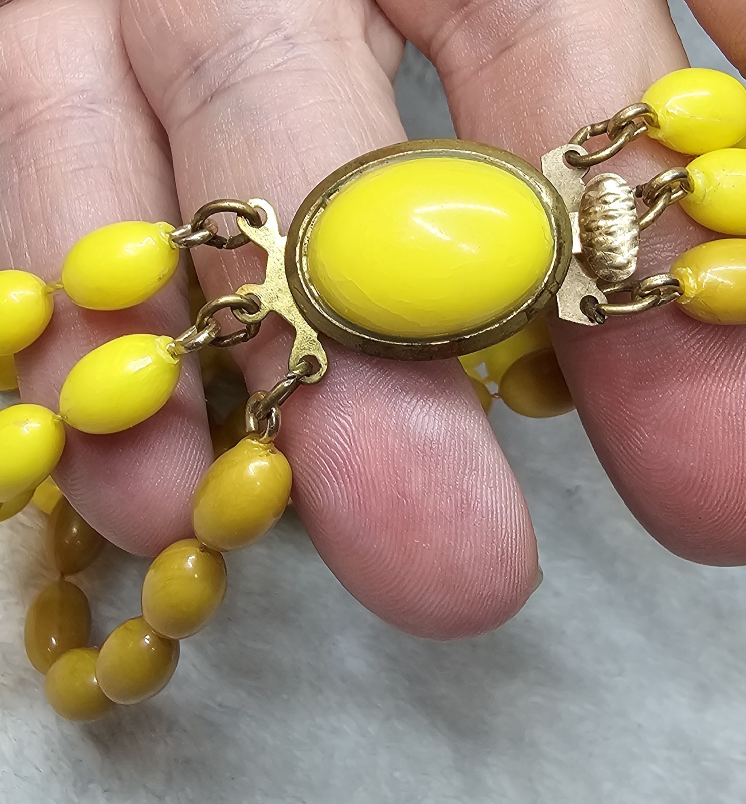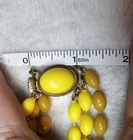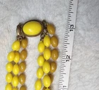 Offered is an authentic vintage Bakelite multi-strand necklace dating to the late 1930s–1940s, featuring beautiful yellow and butterscotch Bakelite beads with an oval Bakelite cabochon clasp set in brass. The necklace showcases classic early Bakelite characteristics, including rich opaque color, subtle age patina, and period-correct brass findings. The multi-strand construction and statement clasp make this a standout collector piece. ✨ Details: Genuine phenolic Bakelite Yellow & butterscotch color palette Multi-strand design Oval Bakelite cabochon clasp Brass findings Weight: 45.7 grams Circa 1930s–1940s This is not Lucite or modern resin — correctly identified and accurately described for Bakelite collectors. A bold, collectible example of early plastic jewelry from the golden age of Bakelite. 📏 MEASUREMENTS Length: see photos with ruler Weight: 45.7g 📌 CONDITION Very good vintage condition. Light age-appropriate wear and natural patina consistent with early Bakelite. No cracks or repairs noted. 🔍 ITEM SPECIFICS Era: Art Deco / Early Mid-Century Material: Bakelite (Phenolic) Color: Yellow / Butterscotch Style: Multi-Strand, Statement Vintage: Yes 🔖 HASHTAGS #Bakelite #VintageBakelite #YellowBakelite #ButterscotchBakelite #ArtDecoJewelry #1930sJewelry #Phenolic #CollectorJewelry #VintageStatementNecklace #BakeliteNecklace