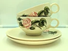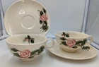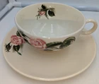 Vintage Ballerina Moss Rose Coffee Tea Cup & Saucer Set of 2 by Universal 1950's. Very nice pre-owned condition with no damage, not even a scratch. These cups and saucers are just adorable and very 1950's. The underside of the plate is stamped "Universal Oven Proof Union Made USA" with a picture of a ballerina and the word Ballerina printed over the figure. It looks like it is stamped in platinum. They look to be a 6-8 ounce cup. All of my items are carefully packed for shipping, no matter their value - $5 items are wrapped with the same care as a $200 item. My goal is to have your purchase arrive safely. I use recycled packaging when possible but mostly use new, high quality products so your item will arrive intact without damage. Large, heavy and fragile items are harder to use combined shipping with but just ask if you would like to purchase more than one item and I am more than happy to do so if feasible. If not, maybe we can work out a shipping discount. Thank you and hopefully you will visit my store again!