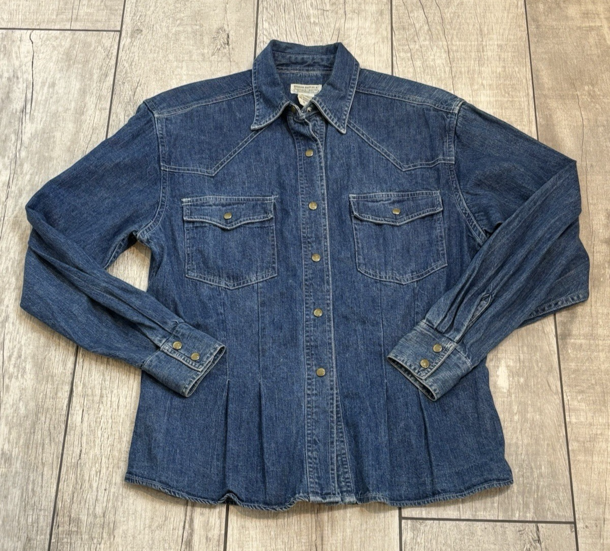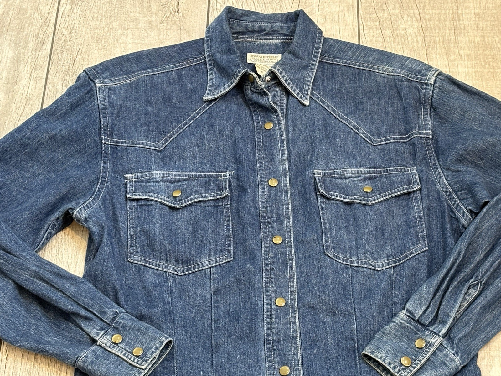 Authentic Vintage 90's Banana Republic Safari & Travel Clothing Company Western Denim Pearl Snap Long Sleeve Shirt Women's Size 6. Please see photos for measurements and condition. In excellent pre-owned condition-no rips, tears or holes. Fading in different areas of shirt-shoulder cuffs, see photos. Feel free to reach out with any questions. This is a previously owned and used item. It may have signs of wear and previous use. Features: • Style Profile: 90's, Y2K, Western, Cowgirl, Rodeo, Hipster, Preppy, Beach • 100% Cotton, Vintage 90's, Authentic, Pearl Snap, Double Snap Cuff, 2 Pearl Snap Pockets, Point Collar, Darts • Machine Wash or Dry Clean • Chest: 38 in • Waist: 35 in • Hip: 38 in Measurements: - Previous washings may change the sizing written on the tag. - Please refer to the photos above for all measurements. - Please compare our measurements to that of one of your favorite garments. - Please note, item measurements are approximate. - Colors may differ slightly in shade from photos to actual item due variances caused by photography lighting and monitors. All items are bagged and sealed after being photographed, then stored in a smoke free environment to ensure the item is exactly the same as when photographed. We always carefully package and ship ASAP. Feel free to contact us with any questions. All items are washed per eBay standards and policies. We greatly appreciate your business! Please remember to leave positive feedback if you are happy with your purchase! Thanks for looking!