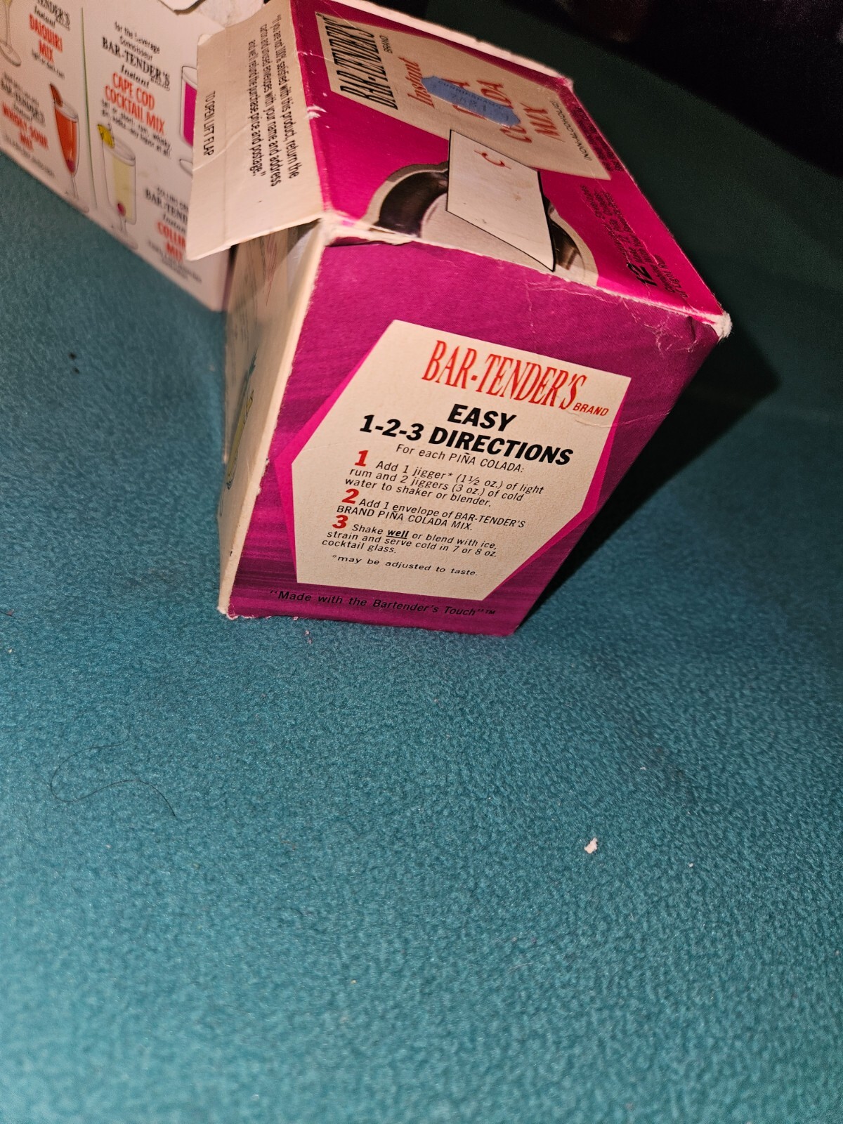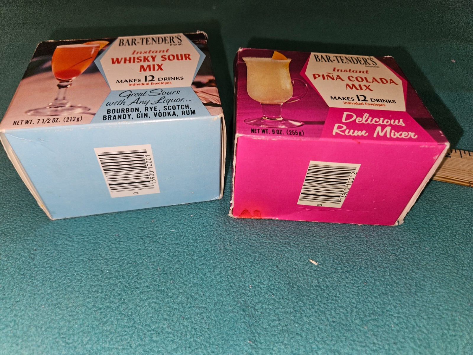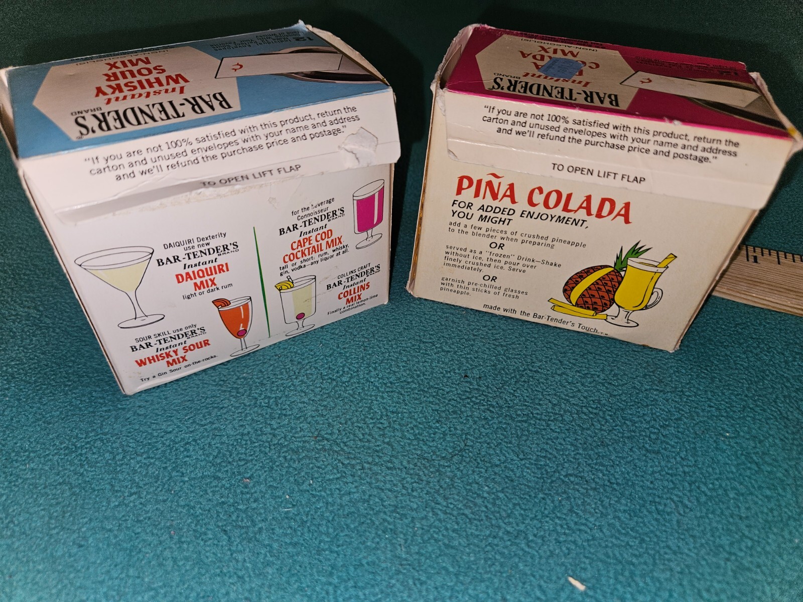 2 Box's Vintage Bar-Tender's Brand Pina Colada & Whisky Sour Mix Advertising. There are 9 packets in each box the packets are not useable from the 1960s. This would look great for that person looking for that Mid Century Modern Look. Please look at all pictures box's show wear from age and use