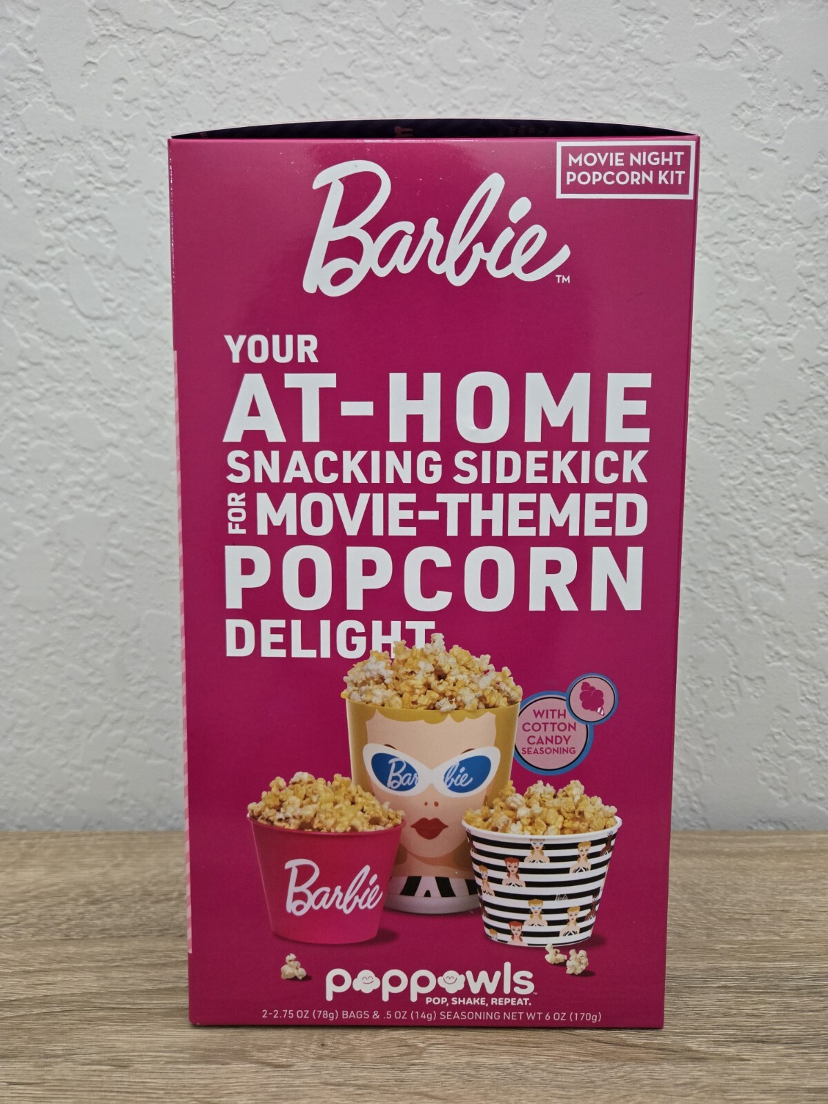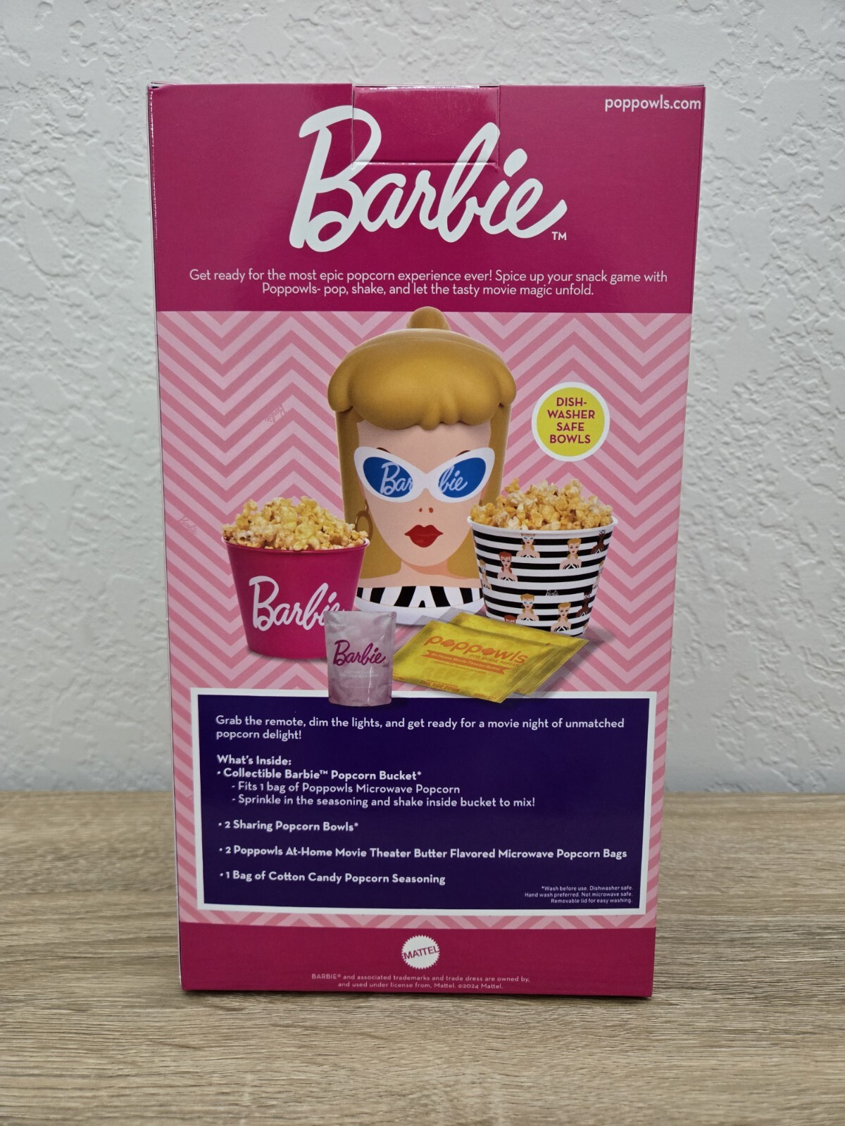 *Free shipping with USPS Ground Advantage. Ships ASAP. Packaged with care. Smoke-free home.* The product is a Poppowls Barbie Movie Night Popcorn Kit, featuring a collectible popcorn bucket, cotton candy popcorn seasoning, sharing bowls, and microwave popcorn. It is part of the Barbie franchise, with a multicolor design and a height of 8 inches. The set is boxed and dishwasher safe, manufactured in China in 2024, and suitable for movie-themed play. Item is brand new. Best by 09192025.