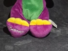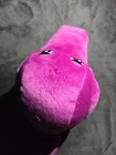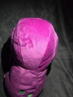 This Barney plush measures about 12" tall in the sitting position. The paint on its teeth has crumbled away and there are a couple of small hard spots on its head. This plush was surface washed. The voice box is in great condition and works amazingly. It sings the raindrops and gumdrops song when pressed. I'm not sure exactly what year this plush is from because I was not able to find this exact one posted online. I'm assuming it is from the 90's or early 2000's