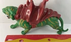 This Vintage Battle Cat He-Man Masters of the Universe action figure by Mattel is a classic collectible from the 1980s TV show. Made of plastic and featuring He-Man's iconic Battle Cat character, this 1:12 scale toy is a must-have for fans of the Masters of the Universe franchise. Although it does not come with a helmet, it is still a vintage piece that captures the essence of the beloved animated series. Displaying the signature Filmation animation style and bearing the original Mattel branding, this action figure is a timeless piece of nostalgia for collectors and enthusiasts alike. Please see all photos for details and condition