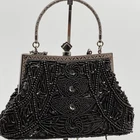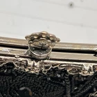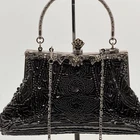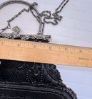 This vintage black evening handbag features intricate beading and silver hardware, adding a touch of elegance to any outfit. The compact rectangular shape and shoulder strap make it both stylish and practical for a night out. The satin lining and inner pockets add a touch of luxury, while the stainless steel hardware ensures durability. The metallic finish and chain strap add a glamorous touch to this small yet eye-catching handbag. Perfect for a special occasion or adding a vintage flair to your everyday look.