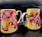 This vintage Limoges China mug set features a beautiful hand-painted design of yellow and pink grapes with gold accents. The two-piece set is made of porcelain in a matte finish, showcasing a capacity of 20 oz and an item height of 5 inches. The mugs are artfully crafted with a production style of art pottery, dating back to the 1980s. These mugs are a charming addition to any collection of decorative dinnerware. Perfect for a lovely Galentine’s or Valentine’s Day fun event!