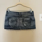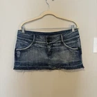 This is a vintage Bebe mini jean skirt in size 29, designed for juniors. The skirt is in a stylish blue color with a short length, making it perfect for summer and spring seasons. It features a classic mini style and was manufactured in the United States. The Y2K aesthetic adds a trendy and nostalgic touch to this piece, making it a fashionable choice for any young woman looking to add a retro flair to her wardrobe.