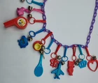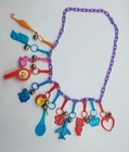 The Vintage Bell Charm Necklace with 12 Plastic Clip-on Charms is a retro 80s piece that features a colorful, multi-color design. The purple necklace is adorned with Bell Charms brand logo and originates from Taiwan. This collectible item is perfect for those who appreciate vintage advertising and merchandise, as well as those who love premium charms and prizes from the 1980s era. Each charm adds a unique touch to the necklace, making it a fun and playful accessory for any vintage enthusiast. This item is brand new and was still in the wrapper. I did have to take it out for pictures. Has not been used or worn.