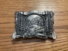 Vintage Bergamot Brass Works belt buckle from 1983 features a rectangular design with a "God's Country" theme. Very beautiful design Made of silver brass in the United States, it fits a 2-inch belt and is suitable for those who appreciate country-inspired accessories.