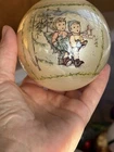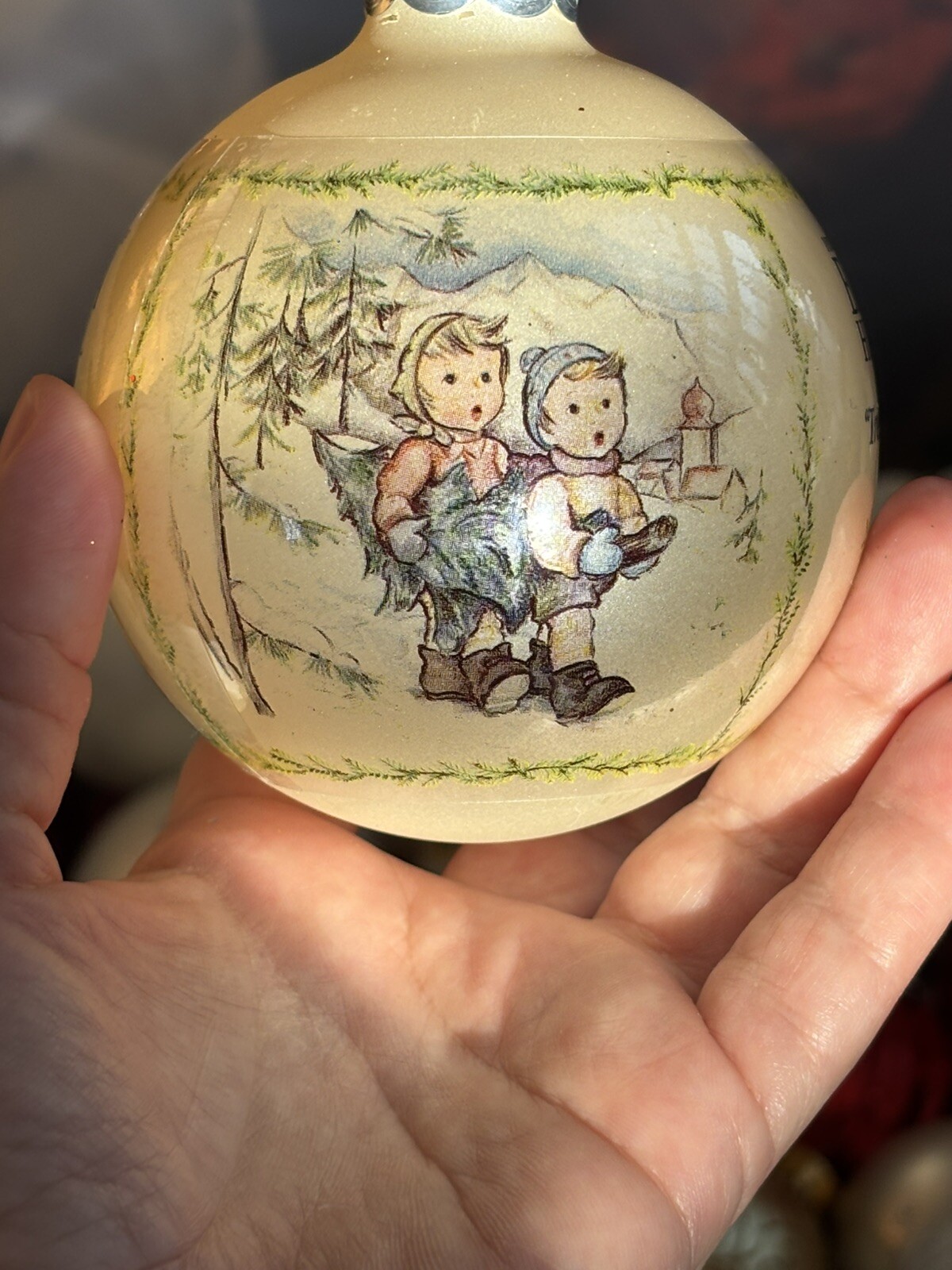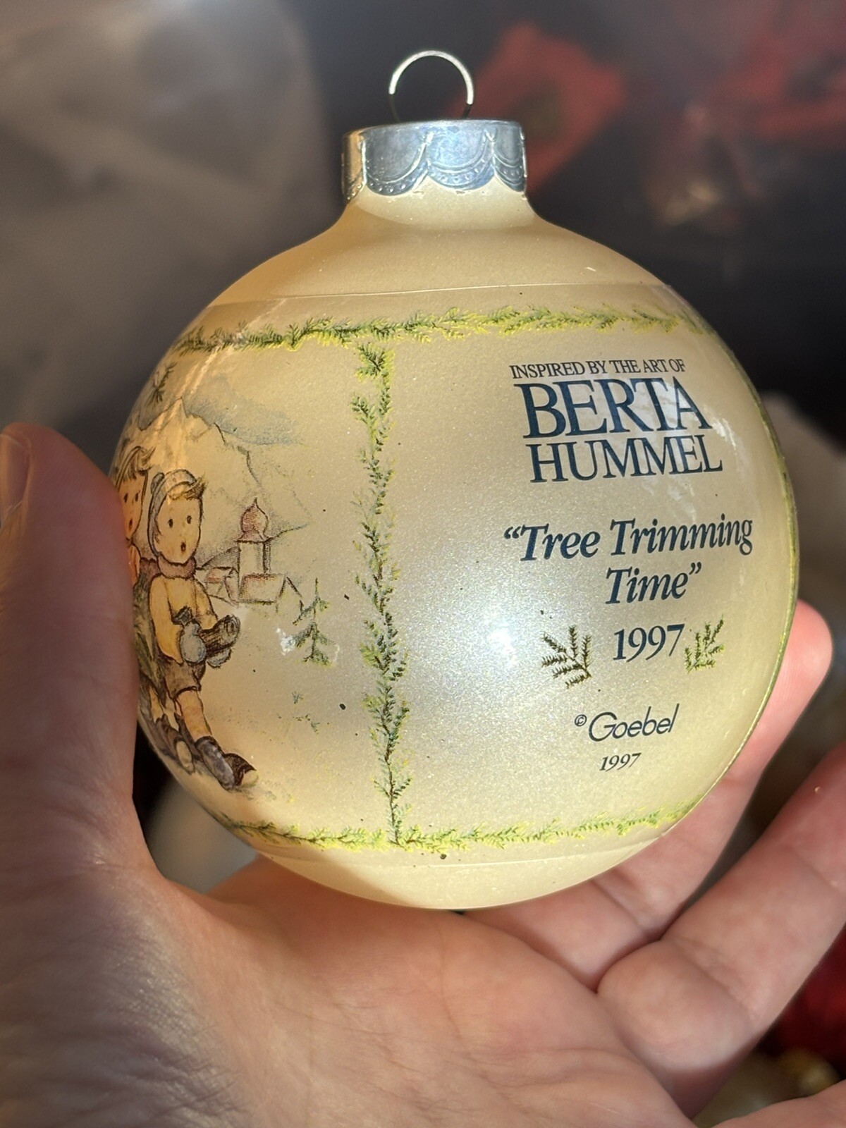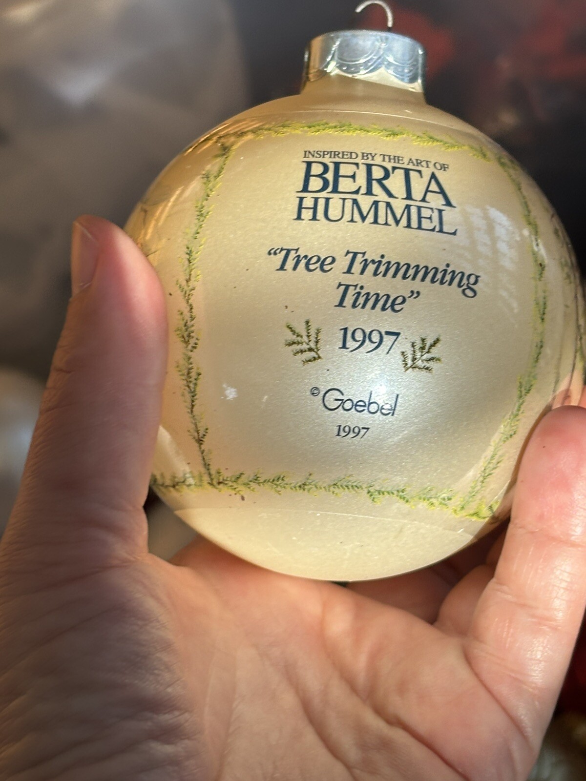 The product is a vintage Berta Hummel Christmas ball from 1997, featuring a tree shape and depicting "Tree Trimming Time." It is part of the collectibles category and would be a charming addition to any holiday ornament collection. The ball is designed with a nostalgic feel and is perfect for decorating a Christmas tree. Vintage ball, normal scuffs