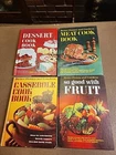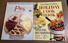 Cook books measure 11.5" x 8.5" each. The blue Chicken cook book was published by Golden Press and gas a spiral binder as shown in photo. The Cookie cook book bottom pages had gotten wet at one time. The first 3 pages are torn. Selling lot as is.