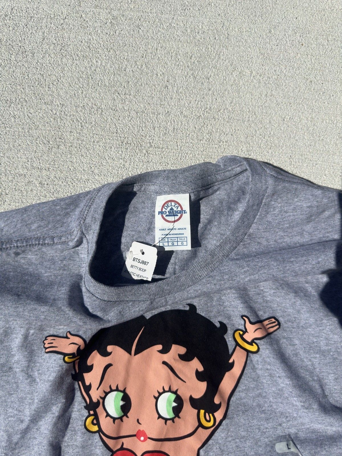 The Vintage Betty Boop Shirt is a men's large size gray short sleeve t-shirt with a graphic print featuring the iconic character Betty Boop. Made from a comfortable cotton blend material, this shirt has a classic crew neck design and a regular fit. With a retro theme and 90s cartoon aesthetic, this vintage shirt is perfect for casual wear and can be easily cared for with its easy-care fabric. Perfect for Betty Boop fans or those who appreciate nostalgic 90s style, this shirt is a fun and stylish addition to any wardrobe. -NWT