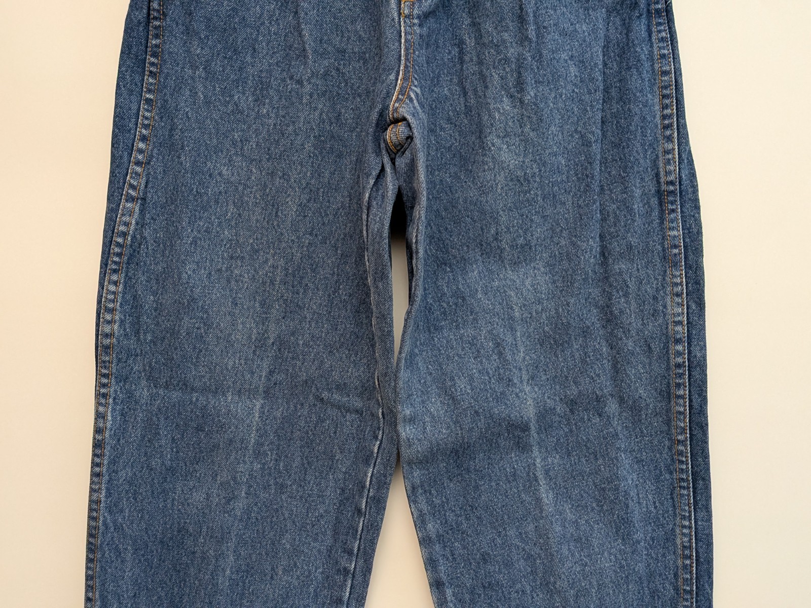 This product is a pair of high waist Vintage Bill Blass Jeans for women in size 6. The jeans feature a pleated design, a 90s tapered style, and are made of 100% cotton denim. With a relaxed fit, zip and button closure, and a 5-pocket design, these jeans are perfect for any season and can be machine washed for easy care. The classic blue color and solid pattern make them a versatile wardrobe staple that exudes a retro charm.