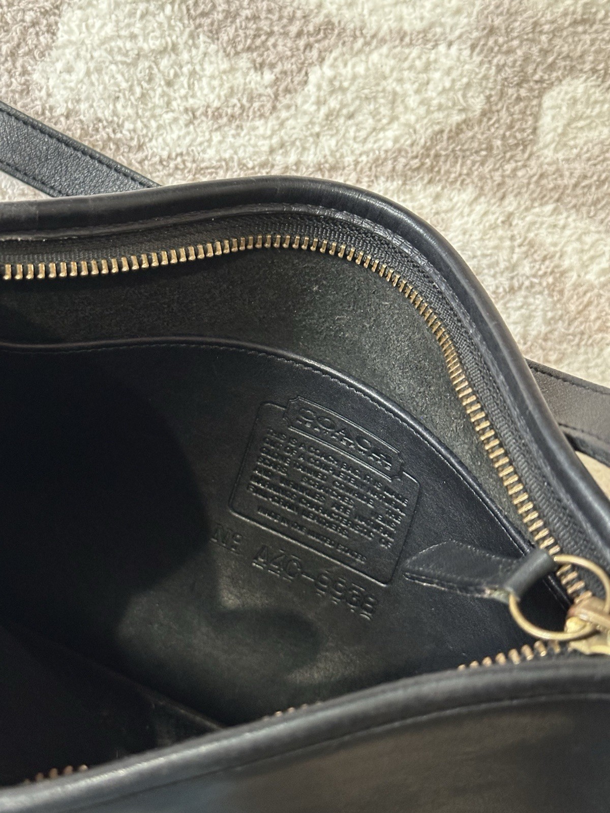 The Vintage Black Coach Crossbody is a classic and stylish women's handbag made of high-quality leather. With a solid black exterior and gold hardware accents, this small rectangular bag features a zip closure and a crossbody strap handle. Crafted by the renowned brand Coach, this timeless piece is perfect for everyday use and adds a touch of sophistication to any outfit.